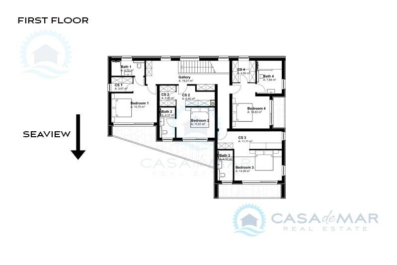 Der erste Stock besteht aus vier Schlafzimmern mit eigenem Bad und überdachten Terrassen mit schöner Aussicht.
