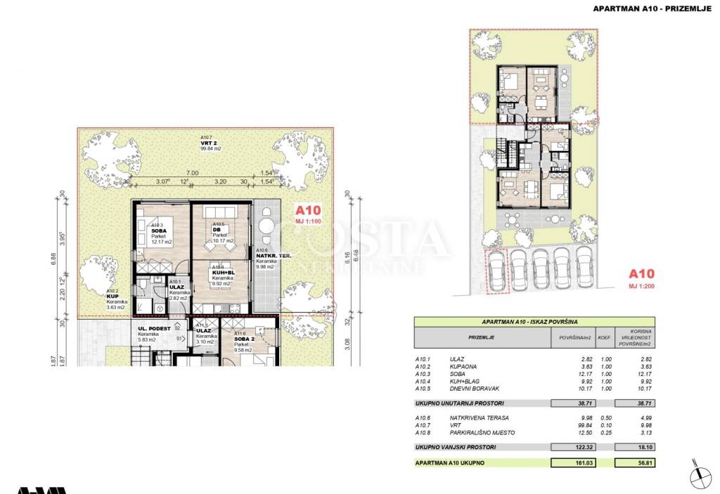 In Povljana auf der Insel Pag steht eine im Bau befindliche Einzimmerwohnung zum Verkauf. Die 38,71 m² große Wohnung befindet sich im Erdgeschoss eines kleineren Wohngebäudes mit insgesamt fünf Wohneinheiten. Sie besteht aus einem Wohnzimmer, einer Wohnküche, einem Schlafzimmer, einem Badezimmer und einer überdachten Terrasse von zusätzlich 9,98 m². Zur Wohnung gehören außerdem ein 99,84 m² großer Garten und ein privater Parkplatz im Innenhof des Gebäudes. Die Gesamtnutzfläche der Wohnung inklusive Nebenräume beträgt 161,03 m² (KV 56,81 m²).
