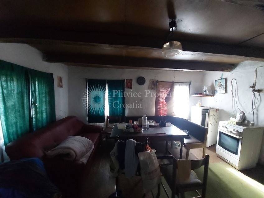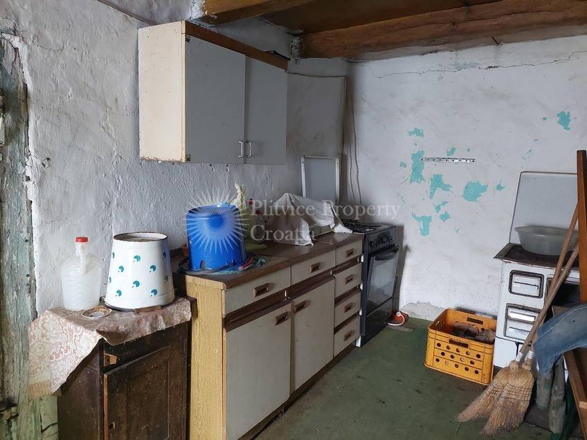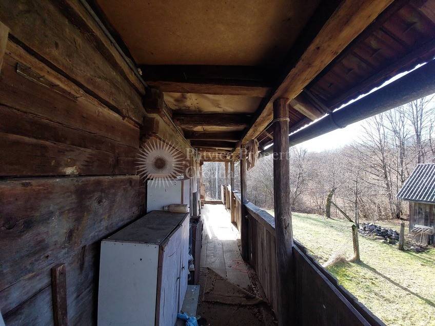 The house itself features two main rooms connected by a traditional wooden balcony, functioning as a living area, kitchen, and bedroom, along with an old toilet. Inside, the house retains its original character with visible wooden beams and a solid wooden floor made of two layers. The property requires a complete renovation, making it suitable for buyers looking for a restoration project with authentic architectural elements.