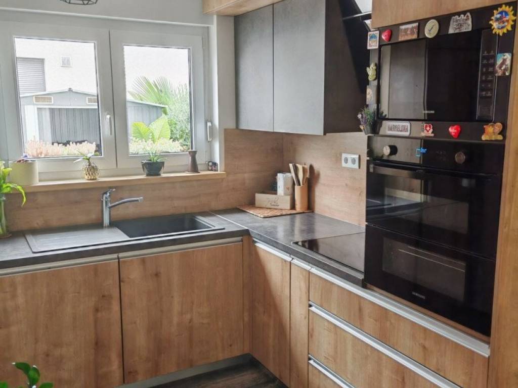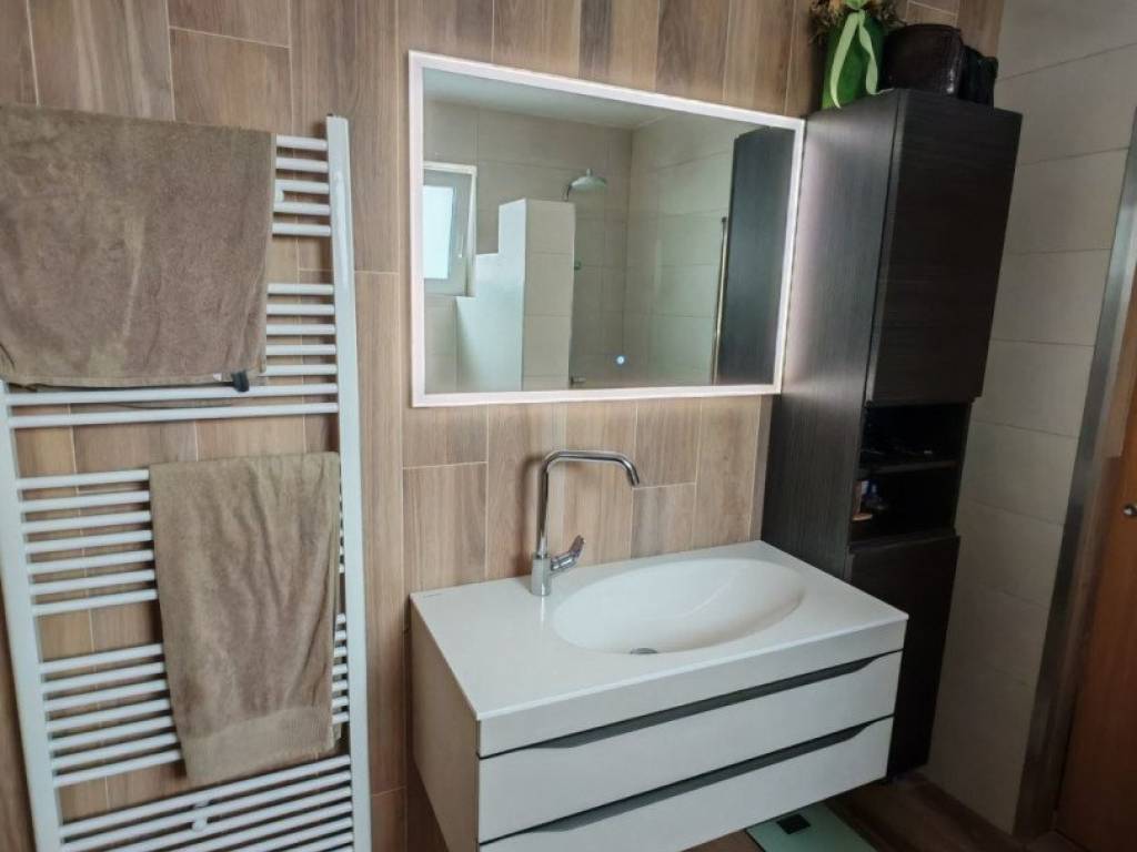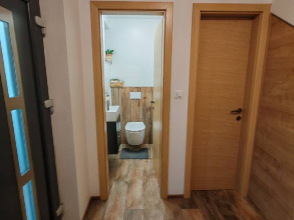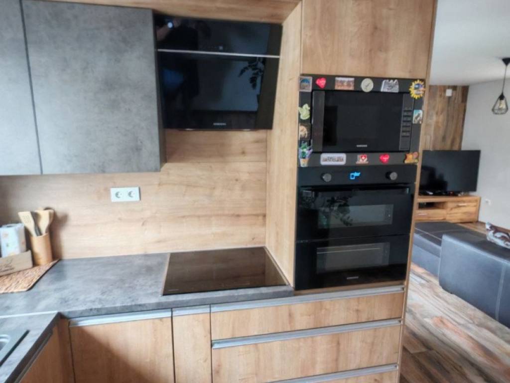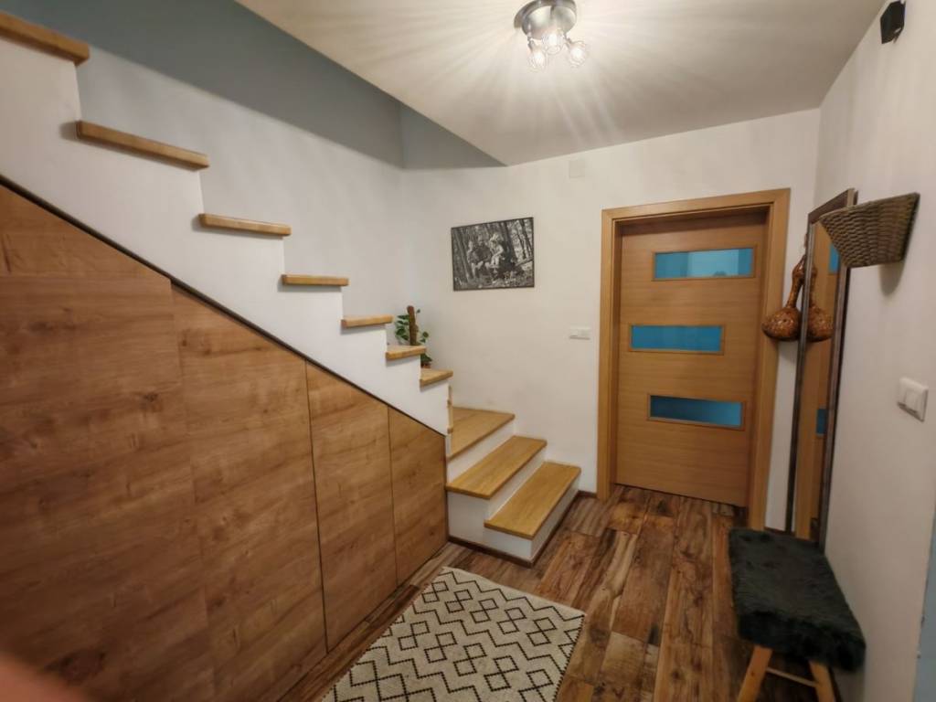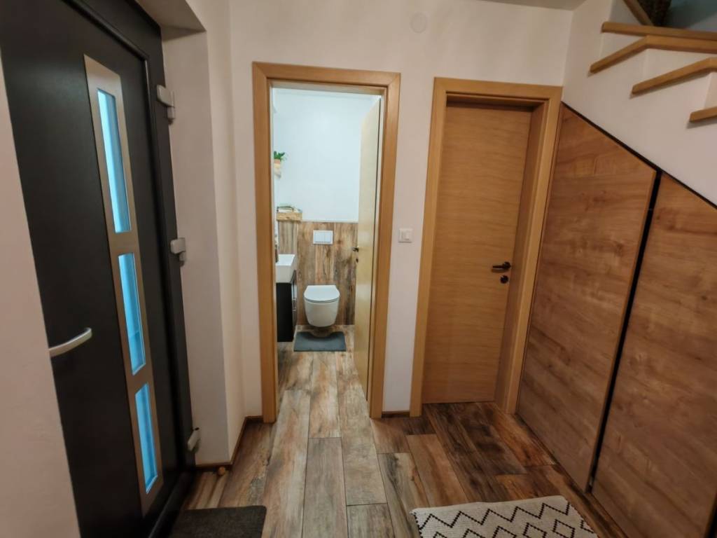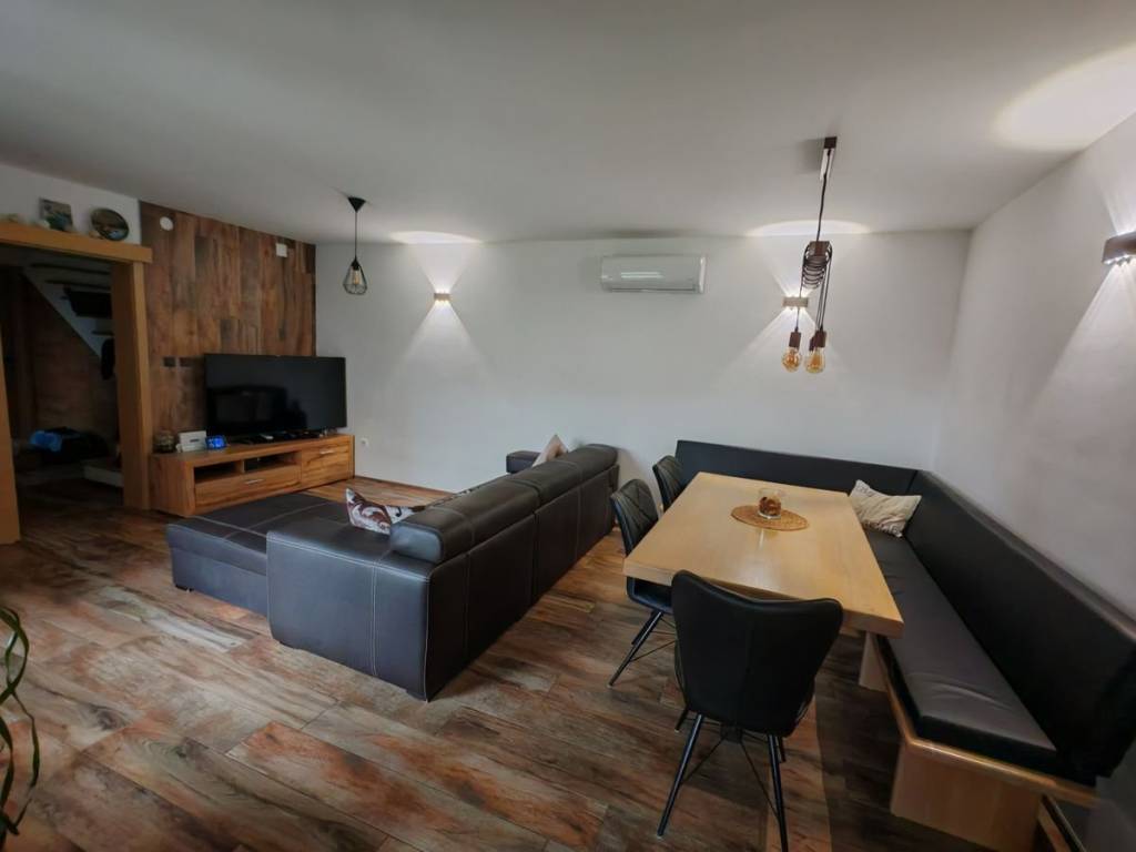 Stan je opremljen namještajem visoke kvalitete, što vam omogućuje da se odmah uselite i uživate u udobnosti. Većina namještaja je rađena po mjeri, dok su unutarnje klupčice na prozorima, kao i gazišta na stepenicama, kao i klupa i stol rađeni ručno od domaćeg drva hrasta iz Međimurja.