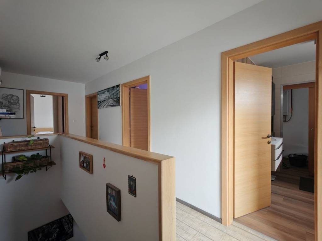 U prizemlju se nalazi ulazni hodnik, wc, ostava, ugradbena garderoba ispod stepenica, kuhinja sa blagovaonom i dnevnim boravkom otvorenog koncepta. Iz dnevnog boravka izlazi se na terasu, dok se stepenicama iz predprostora stana dolazi na drugu etažu stana gdje se nalazi kupaonica sa odvojenim prostorom vešeraja u kojem se nalazi i kondenzacijski bojler Viessmann, (perilica rublja i sušilica), te tri spavaće sobe. Glavna spavaća soba ima predprostor s ugradbenim ormarima s lijeve i desne strane. Sve sanitarije su proizvođaća Kolpa San, dok su slavine (pipe) i konzola za tuširanje Hansgrohe.