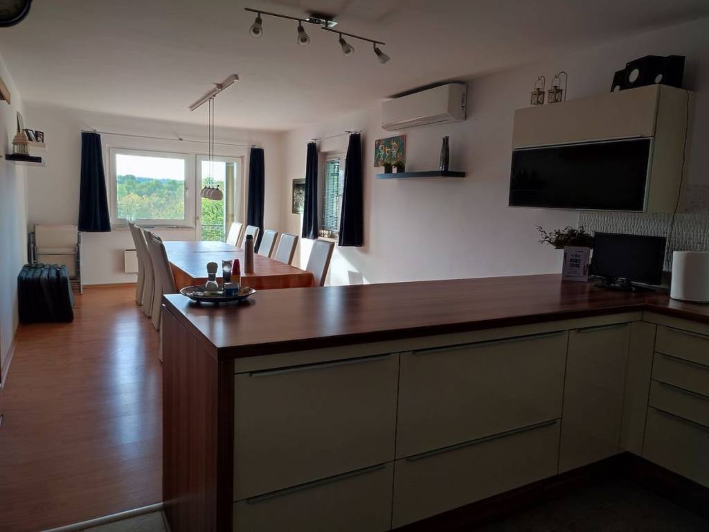 Kat: hodnik, manji WC sa tuš kabinom, dnevna soba s izlazom na balkon, velika kuhinja s blagovaonom i izlazom na balkon te velika kupaona sa jacuzzi kadom, perilicom i sušilicom rublja.