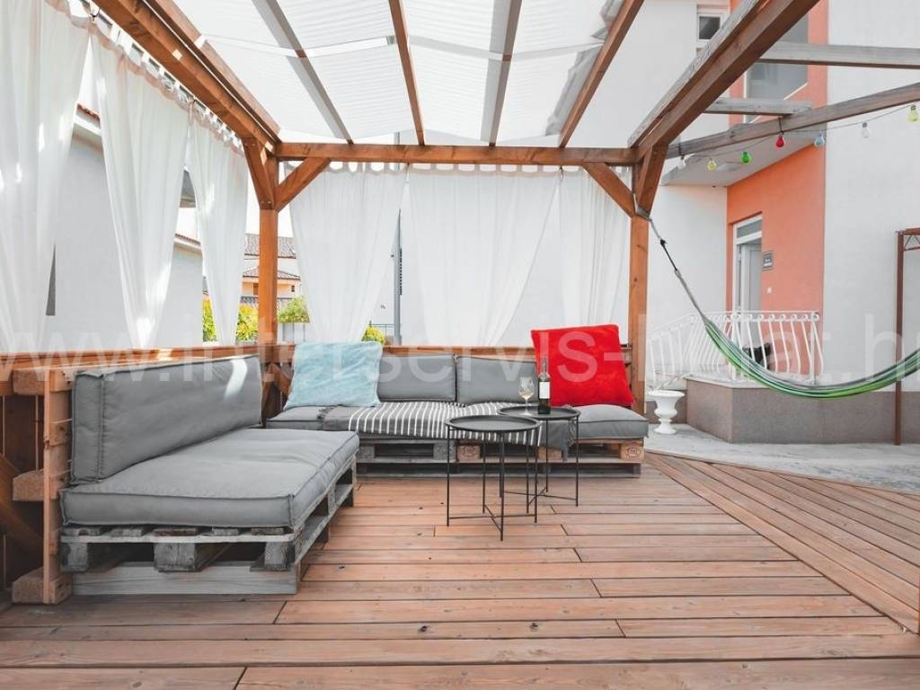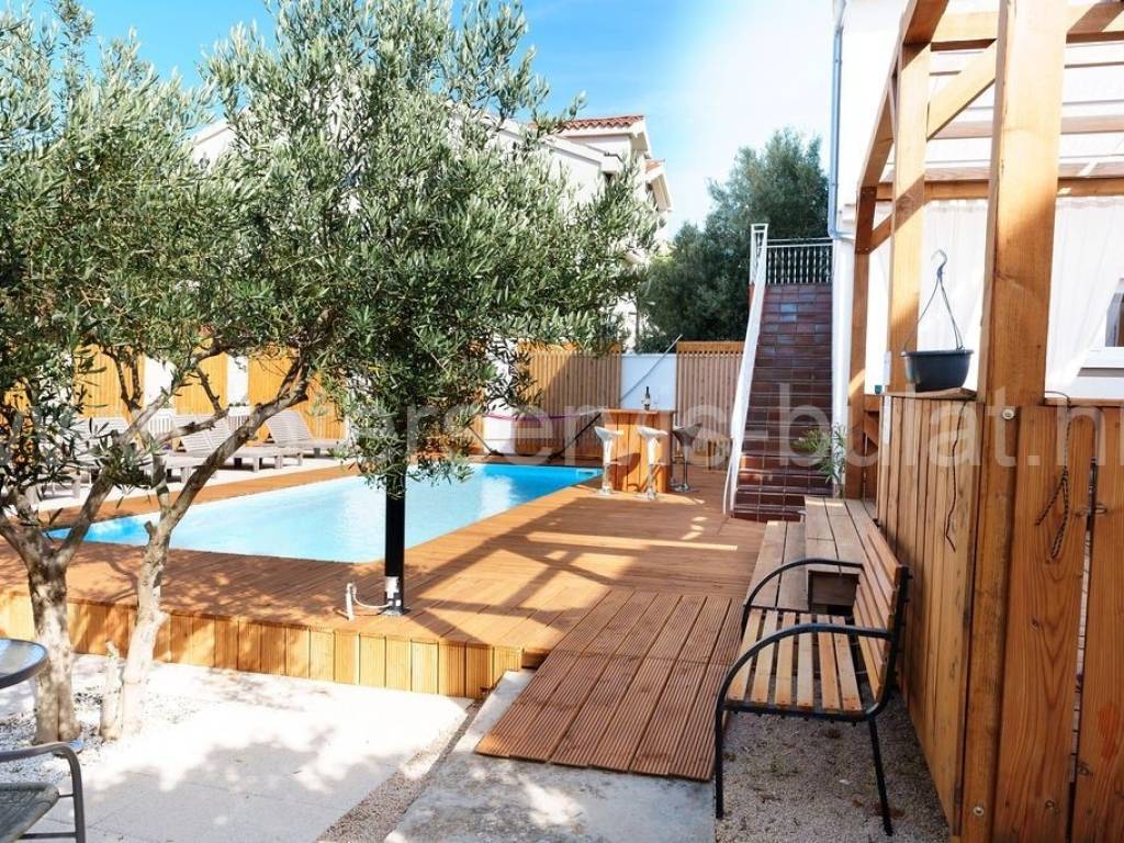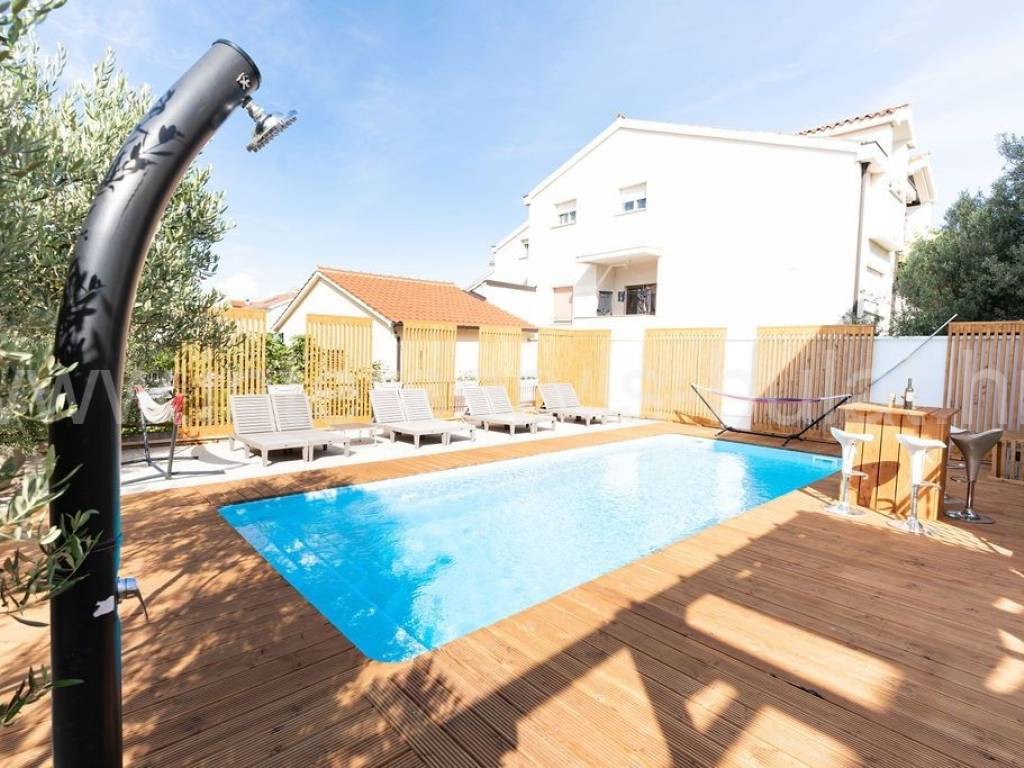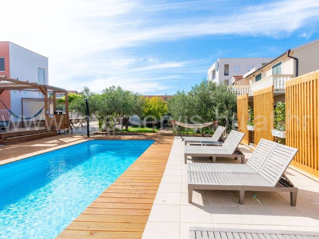 .:::Anspruchsvolles Haus im Herzen von Vodice :::. In ruhiger Umgebung in Vodice, auf einem Grundstück von 1.014qm, befinden sich drei separate Gebäude, die komplett ausgestattet sind und erfolgreich vermietet werden. Das Hauptgebäude, ein Haus mit 320qm Wohnfläche, besteht aus Erdgeschoss, Obergeschoss und Dach. Im Erdgeschoss befindet sich eine Drei-Zimmer-Wohnung mit gemütlichem Wohnzimmer. Eine Innentreppe führt in das Obergeschoss, wo sich eine zweite Drei-Zimmer-Wohnung mit Balkon befindet. Jedes Zimmer hat ein eigenes Badezimmer. Die Wohnungen sind komplett renoviert und modern eingerichtet. Alle Zimmer verfügen über eine Klimaanlage. Das zweite Haus besteht aus 2 Wohnungen (Zwei-Zimmer- und Ein-Zimmer-Wohnung) mit jeweils 50qm Wohnfläche. Im Erdgeschoss ist eine Zwei-Zimmer-Wohnung mit schöner Terrasse und im Obergeschoss eine Ein-Zimmer-Wohnung mit zwei Balkonen. Das dritte Gebäude ist ein freistehendes Parterreobjekt, das als Sommerküche mit Außengrill dient. Im schön gestalteten Innenhof befindet sich ein Swimmingpool mit den Maßen 9m x 3,6m, eine Liegewiese mit Außendusche und eine Vielzahl mediterraner Pflanzen im Garten. Parkplätze sind vorhanden. Sehr attraktive Lage im weiteren Zentrum von Vodice. Die Entfernung zur Uferpromenade beträgt nur 450m. Eine Besichtigung der Immobilie ist nach vorheriger Absprache und Terminbuchung (zwei Tage im Voraus) möglich. Bitte geben Sie bei der Kontaktaufnahme unbedingt die ID-Nummer an. Wir freuen uns auf Ihren Anruf.