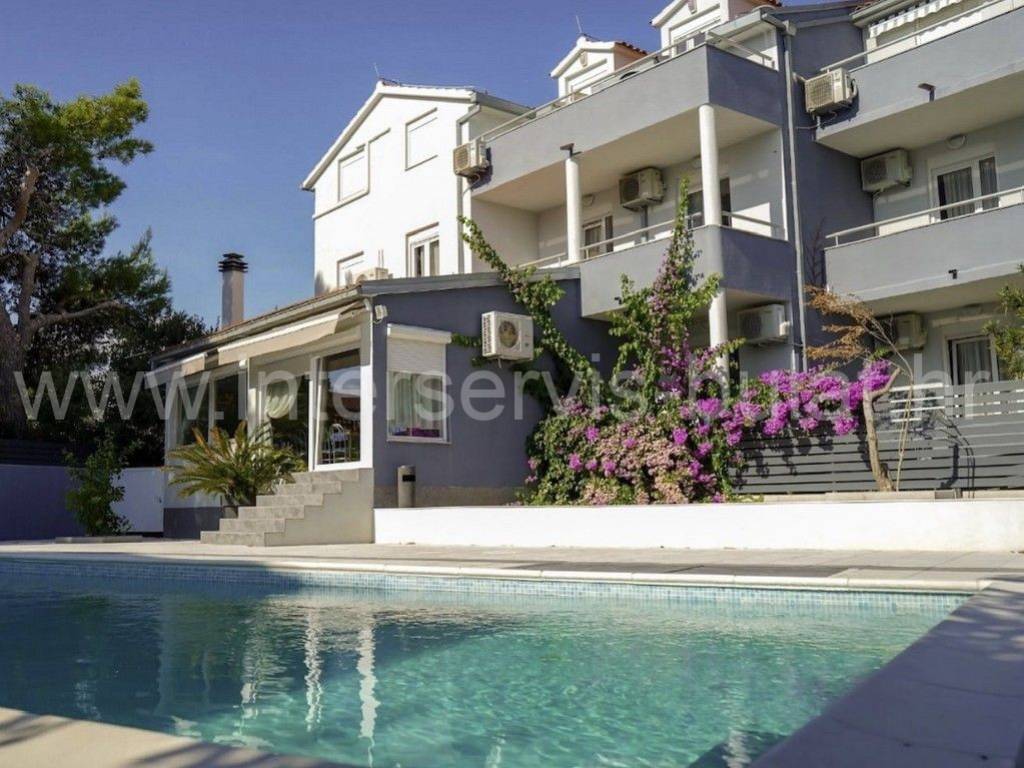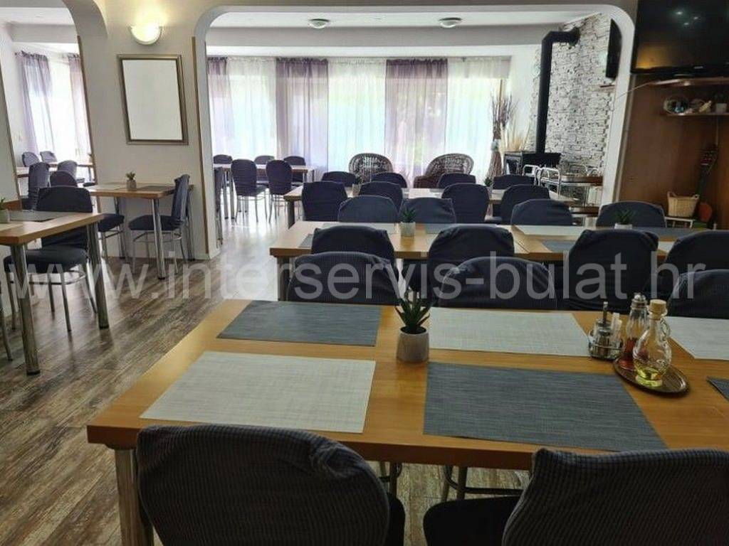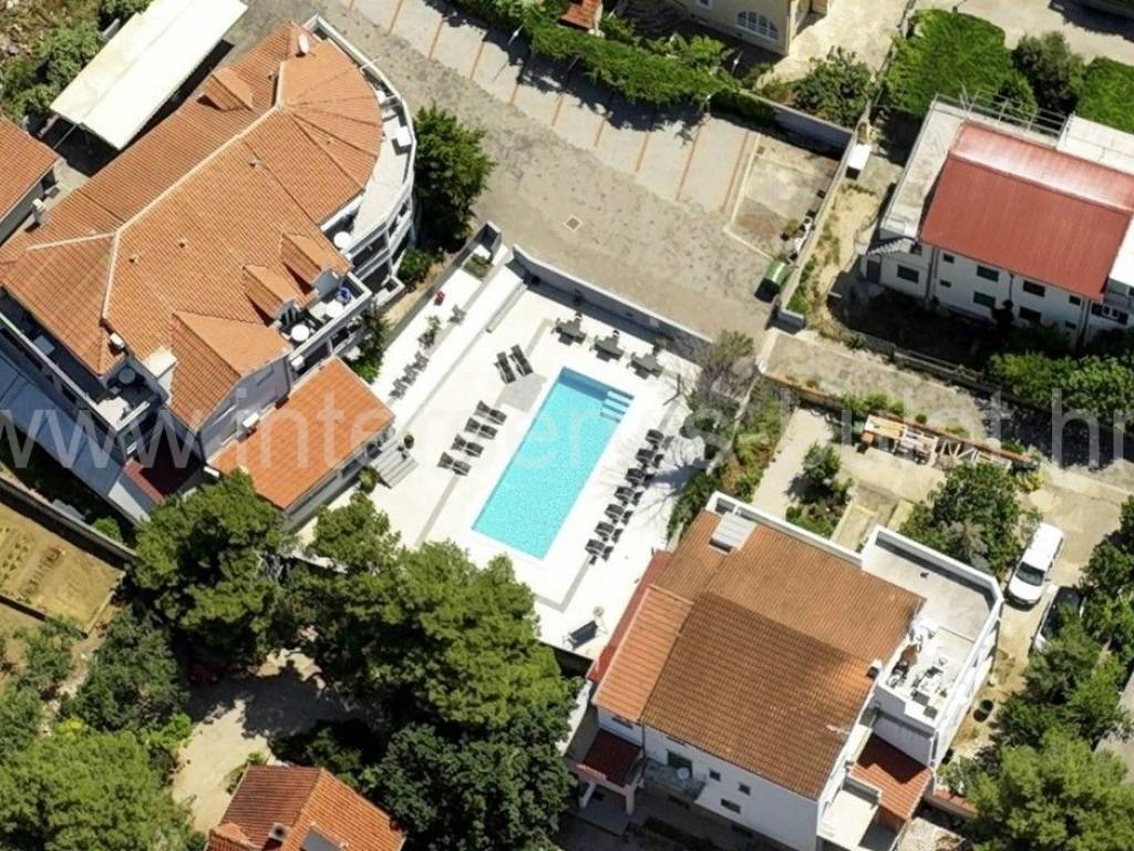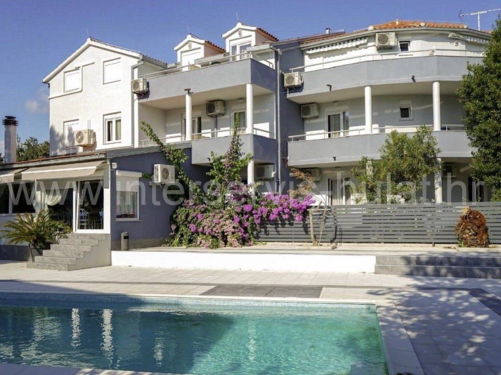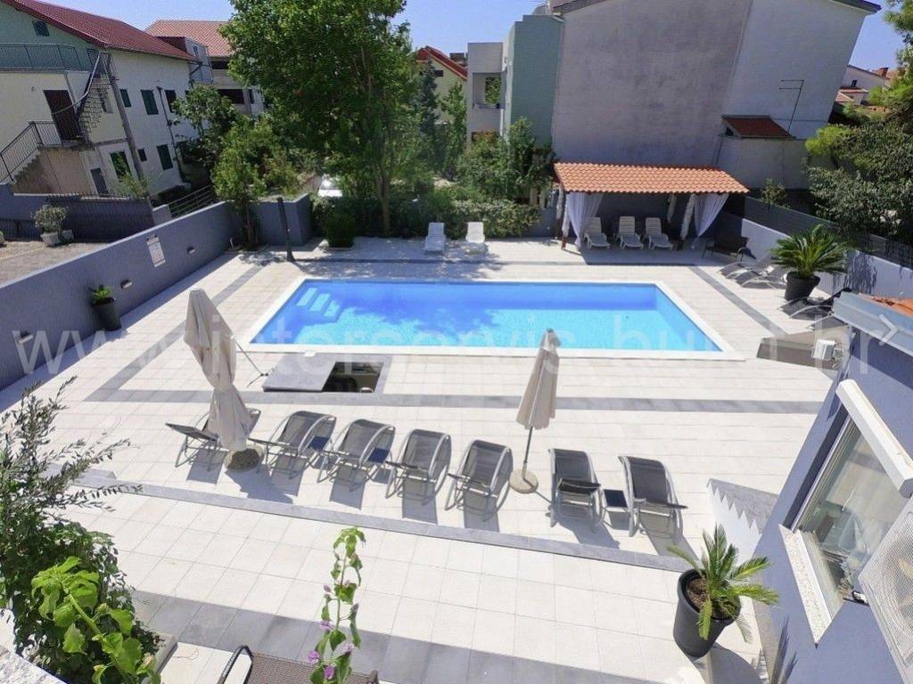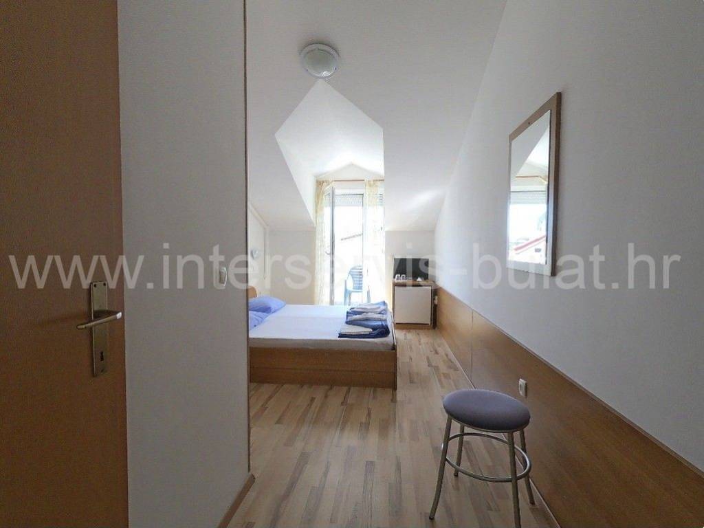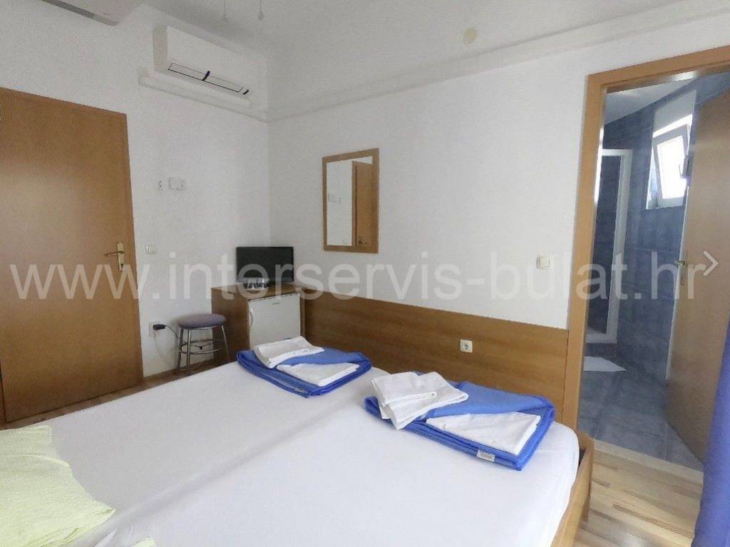 .::: Mini-Hotel in Vodice :::. Unweit vom Hotel Olympia in Vodice befindet sich ein Mini-Hotel mit 860qm Wohnfläche. Es besteht aus Keller, Erdgeschoss, Obergeschoss und Dachgeschoss. Im Untergeschoss des Hotels befinden sich Personalräume, Lagerräume, eine Waschküche, Raum für Ölzentralheizung und Sanitäranlagen. Im Erdgeschoss gibt es ein Restaurant mit ca. 60 Sitzplätzen und zusätzlich 40 Sitzplätze auf der Terrasse. Dazu kommen alle zugehörigen Räume wie Küche, Rezeption, Speisekammer und Sanitäranlagen. Die Hotelzimmer befinden sich im ersten Stock und im Dachgeschoss des Hotels - nämlich 18 Zimmer für zwei Personen und 4 Zimmer für 4 Personen. Das Hotel ist eingerichtet und gepflegt. Vor dem Hotel befindet sich ein 11m x 5m großer Swimmingpool, hinter dem Hotel ein Nebengebäude mit Waschküche und Lagerraum mit Kühlschränken. Außen gibt es einen großen Parkplatz für die Gäste. Das Meer und der Strand sind ca. 350m entfernt. Das Zentrum von Vodice ist ca. 900m weit. Eine Besichtigung der Immobilie ist nach vorheriger Absprache und Terminbuchung (zwei Tage im Voraus) möglich. Bitte geben Sie bei der Kontaktaufnahme unbedingt die ID-Nummer an. Wir freuen uns auf Ihren Anruf.