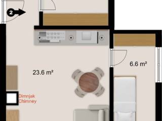 - Im Wohnbereich befindet sich ein Schornstein, der die Möglichkeit zur Installation eines Ofens oder Kamins bietet