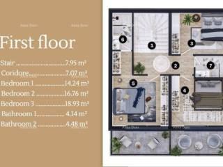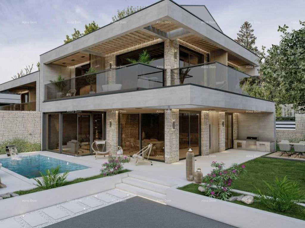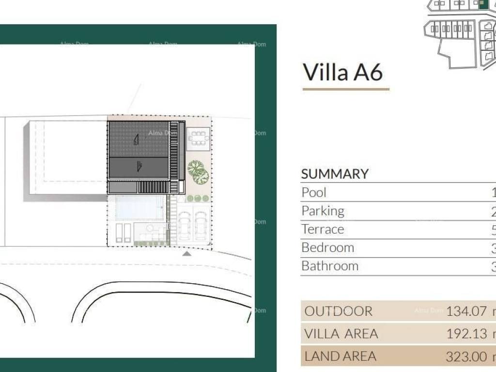Neu im Angebot!Diese wunderschönen Villen haben ein einzigartiges Design. Aufgrund ihrer unglaublichen Lage schaffen sie einen natürlichen und unerwarteten Ausdruck dessen, was schöne, lebenswerte und moderne Räume sein können.Erleben Sie die Natur von einem schönen, modernen Zuhause aus, das minimalistische Architektur mit rustikalen Designelementen kombiniert.Villa A6 mit einer Gesamtfläche von 249,23 m2 besteht aus dem Erdgeschoss und dem ersten Stock. Im Erdgeschoss gibt es einen Flur, ein Wohnzimmer, eine Küche mit Esszimmer, ein Badezimmer und einen Abstellraum.Die erste Etage ist über eine Treppe erreichbar und besteht aus einem Flur, 3 Schlafzimmern, eines davon ist ein Hauptschlafzimmer mit eigenem Bad, einem weiteren Badezimmer und jedes Zimmer hat Zugang zu einem überdachten Balkon.Im Hof gibt es einen Swimmingpool und eine Terrasse von 57,1 m2.Die Villa verfügt über zwei Parkplätze.Die Villen liegen an der wunderschönen Küste Istriens zwischen Meer und Wald und bieten Komfort und Bequemlichkeit – nah genug an den Großstädten für Ihre Großstadtbedürfnisse und weit genug entfernt, um Ihren Rückzugsort am Meer zu genießen. Ihr Sommergefühl hält das ganze Jahr über an.Hinweis: Der angegebene Preis gilt für juristische Personen. Für Privatpersonen wird ein Mehrwertsteuerbetrag von 25 % zum Preis hinzugefügt.Für mehr Informationen, kontaktieren sie bitte:Azra +385 91 6115706+385 98420885azra@almadominvest.com