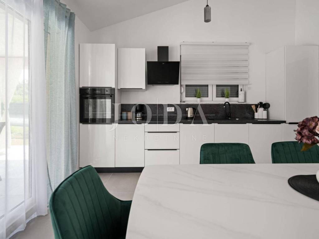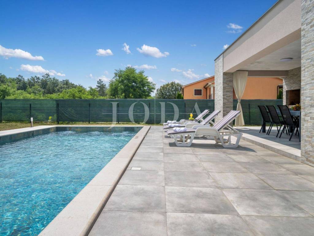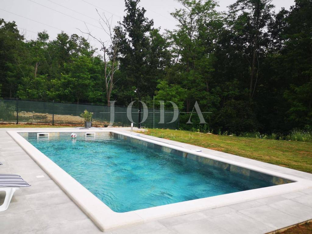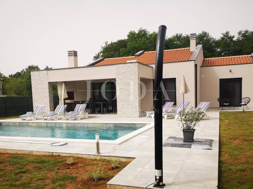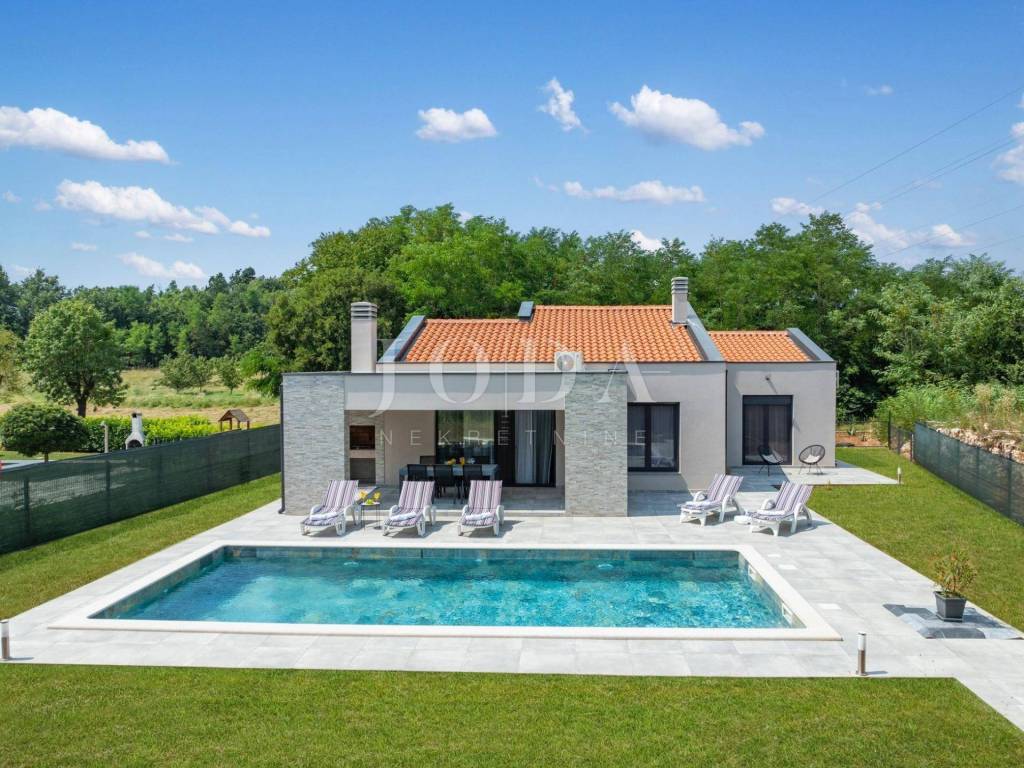 Dieses schöne freistehende einstöckige Haus befindet sich in einer äußerst ruhigen Lage, umgeben von viel Grün und Wald. Die Fläche von 126m2 besteht aus: Eingangshalle, Wohnzimmer mit offener Küche und Esszimmer, drei Schlafzimmer, davon das Hauptschlafzimmer über eine eigene Terrasse, drei Badezimmer und eine Waschküche in jedem Zimmer. Große Glaswände führen zu einer überdachten Terrasse mit Grill und Sommerküche. In der Verlängerung der Terrasse gibt es einen Swimmingpool und eine Liegewiese, umgeben von viel Grün und komplett eingezäunt. Es wird komplett ausgestattet verkauft. Parkplatz für mehrere Autos. Es ist ideal für jemanden, der Ruhe und Erholung sucht, aber auch Immobilien in Form einer touristischen Vermietung sucht.