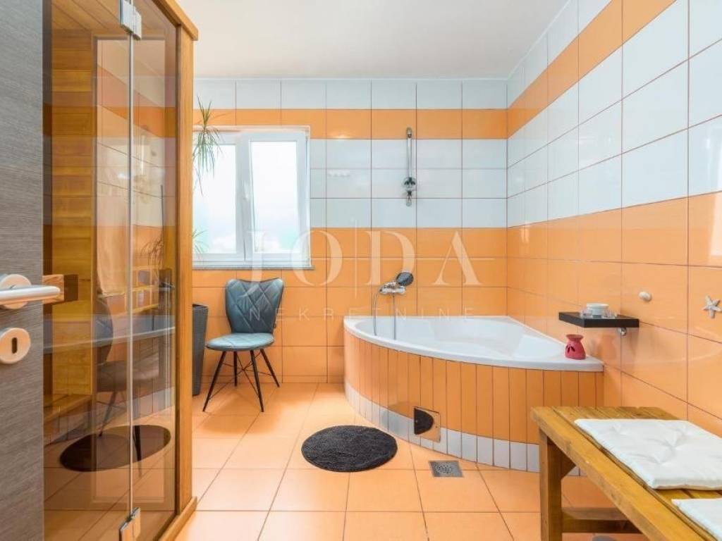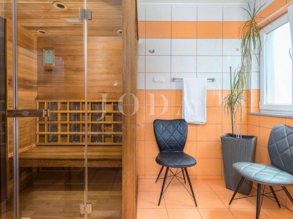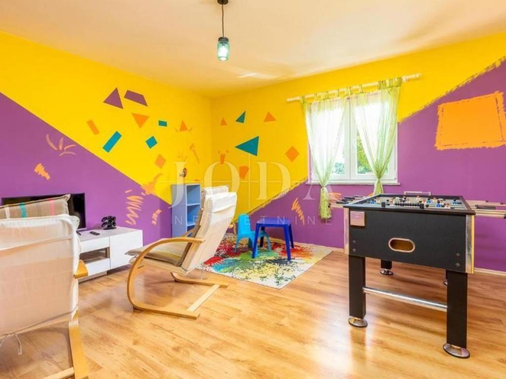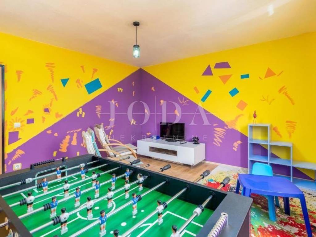 Als zweistöckiges Gebäude erbaut, verfügt das Erdgeschoss über eine Küche mit Esszimmer, ein geräumiges Wohnzimmer, einen Unterhaltungsraum, ein Kinderspielzimmer, einen Fitnessraum, eine Sauna und ein Badezimmer.