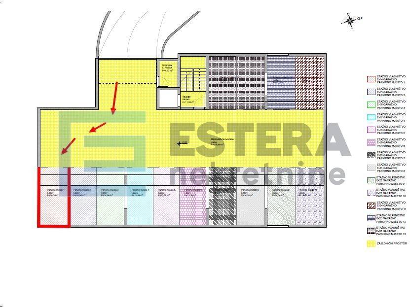 Garažna parkirna mjesta su u podrumu zgrade, do kojih se dolazi vanjskom rampom. Podrumska etaža je zatvorena automatskim vratima, uz otvaranje daljinskim upravljačem.