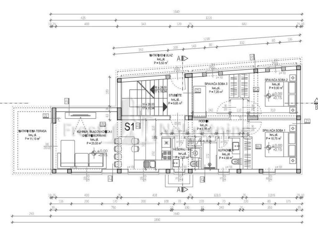 ulaznog hodnika, kupaonice, vešeraja, tri spavaće sobe, kuhinje, blagavaonice i dnevnog boravka u "open space" izvedbi s izlazom na natkrivenu terasu.
