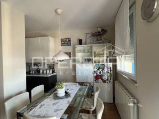 Das Wohnzimmer ist geräumig und separat, während die Küche mit Essbereich eine praktische und zusammenhängende Zone für die Zubereitung und den Genuss von Mahlzeiten bietet. Zwei Schlafzimmer bieten ausreichend Platz und Privatsphäre, ergänzt durch einen Abstellraum, WC und eine Loggia zum Entspannen im Freien.