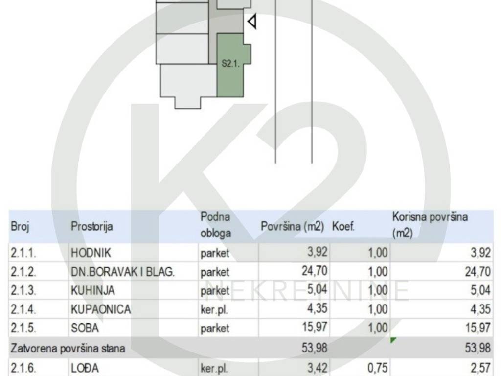 Stan ima 59,21 m2 obračunske površine, korisne površine 62,72 m2, a sastoji se od hodnika, DB+BL, kuhinja, kupaonica, spavaća soba, lođa i balkon.