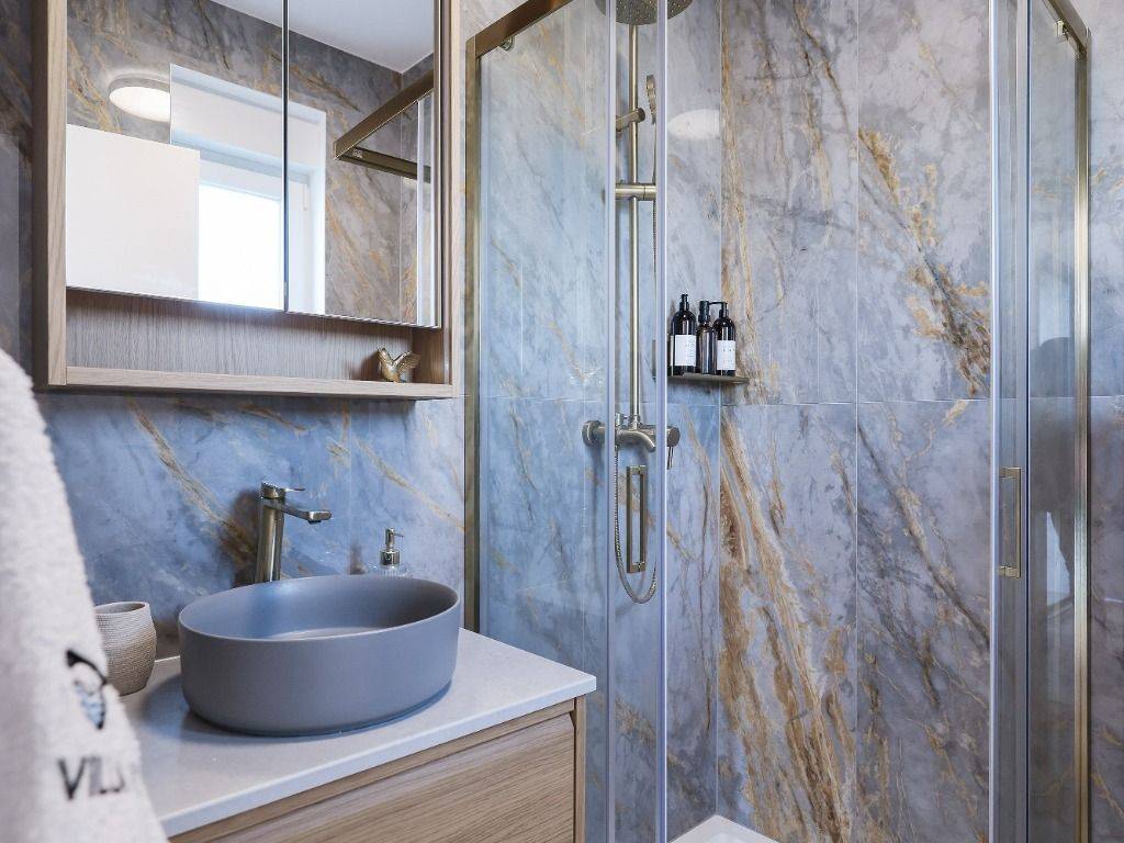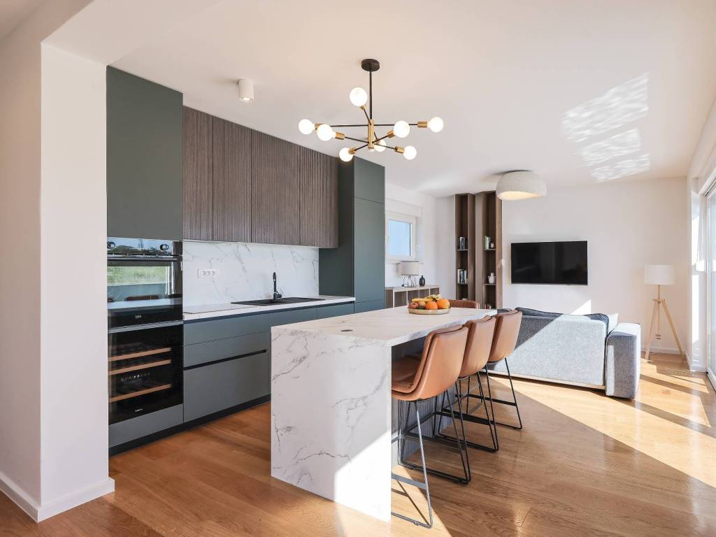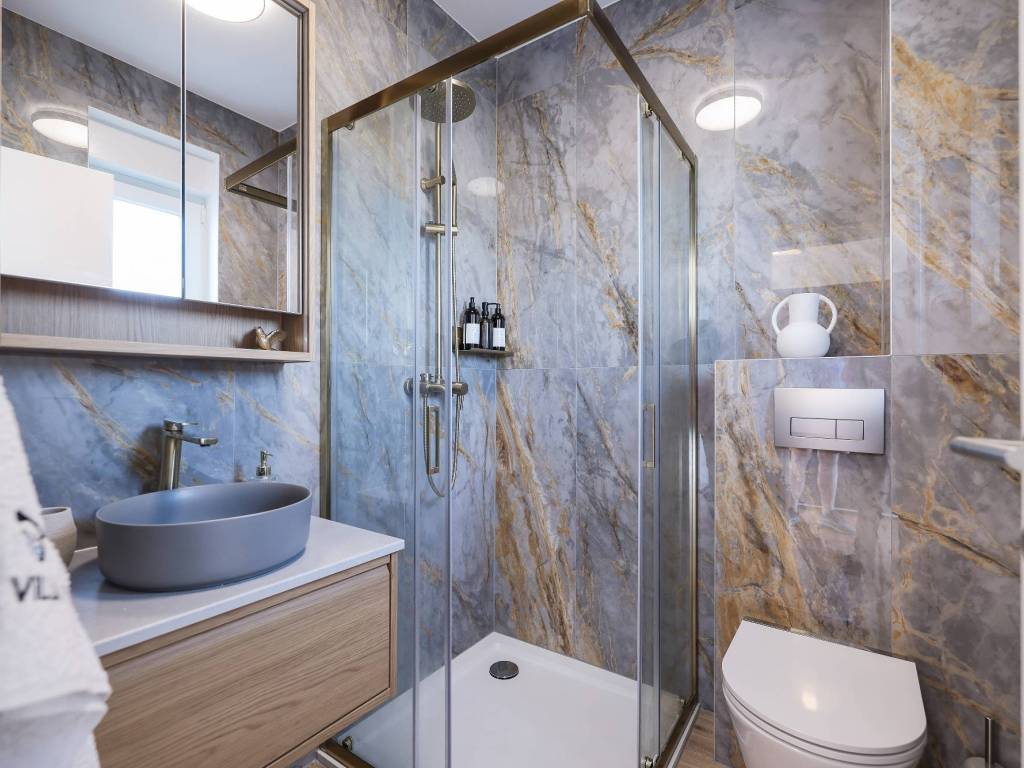 Bjelin seljački pod hrast parket, prvoklasna keramika, Danfoss podno grijanje u cijeloj kući, klima u svim prostorijama, protuprovalna vrata, PVC sa 3-slojnim staklom, termo fasada, A energetski razred