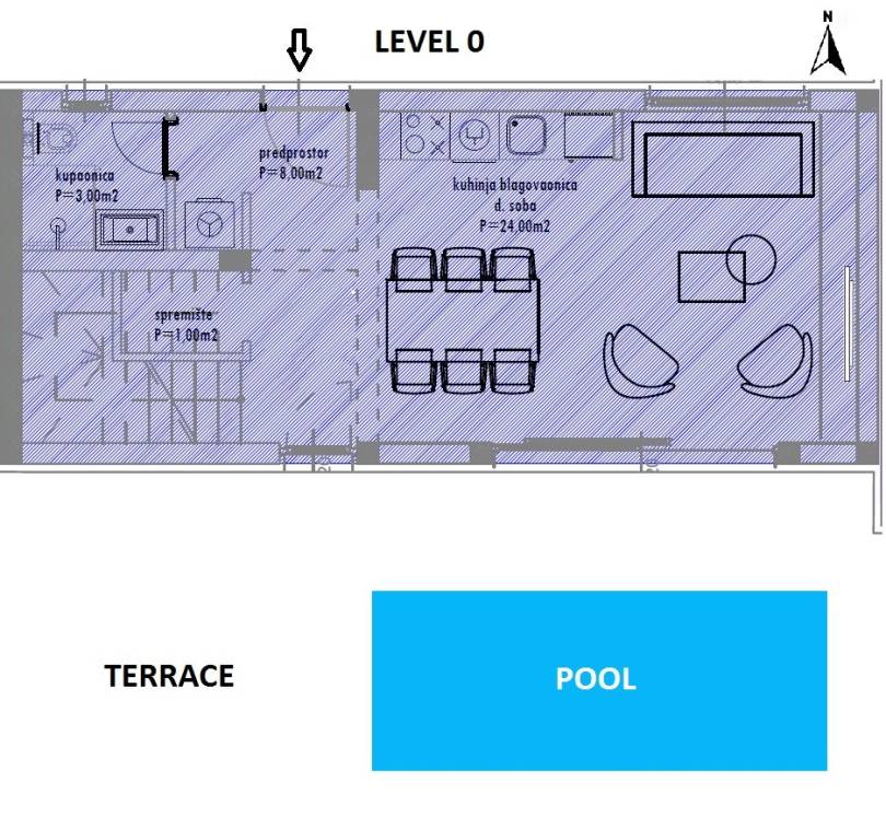prizemlje: dnevni boravak i kuhinja, kupaonica 1, terasa sa bazenom