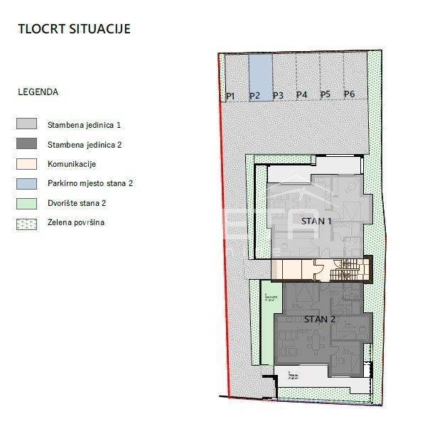 Ukupno je osigurano 6 parkirnih mjesta. Uz svaki stan obavezna je kupnja minimalno 1 parkirnog mjesta, uz mogućnost dodatnog.