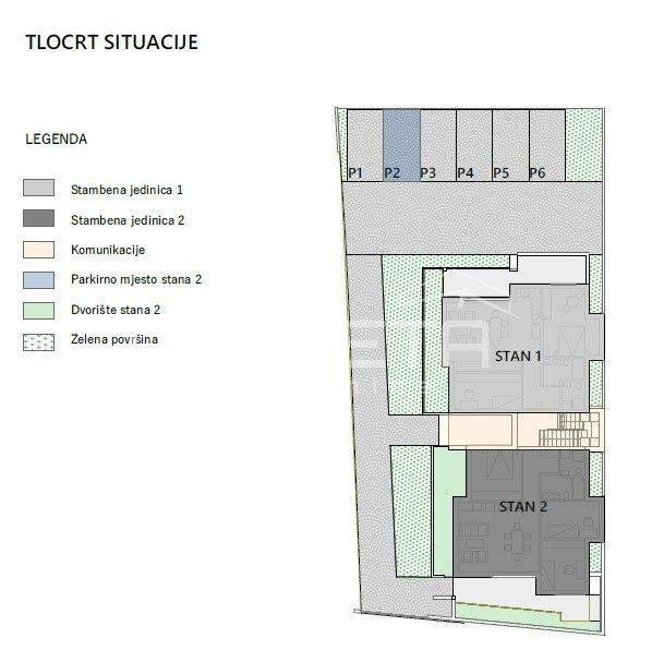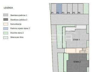 Ukupno je osigurano 6 parkirnih mjesta. Uz svaki stan obavezna je kupnja minimalno 1 parkirnog mjesta, uz mogućnost dodatnog.
