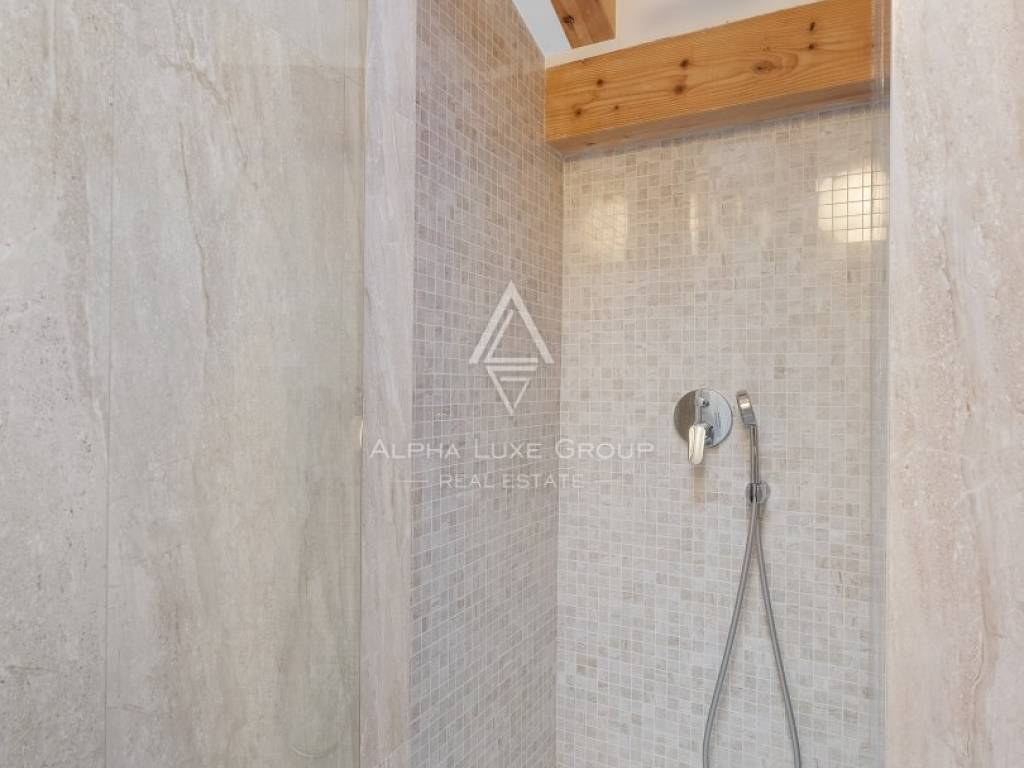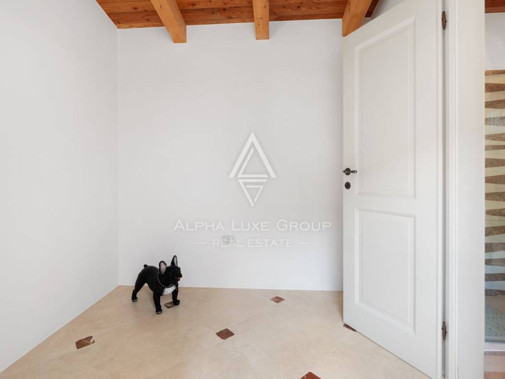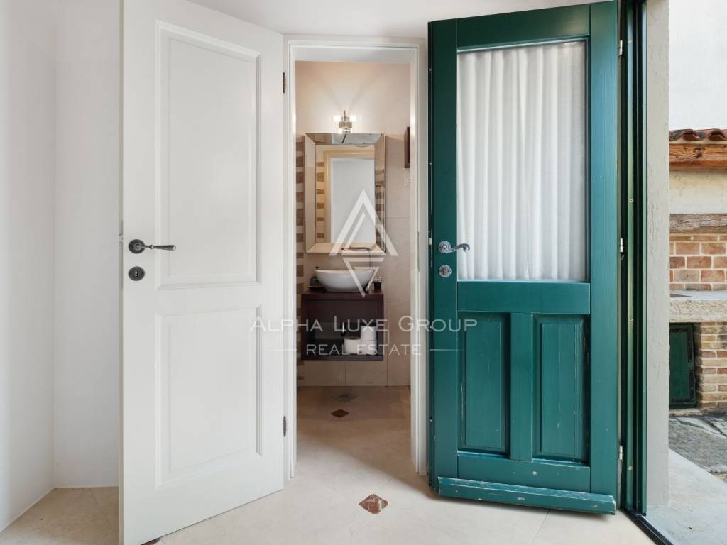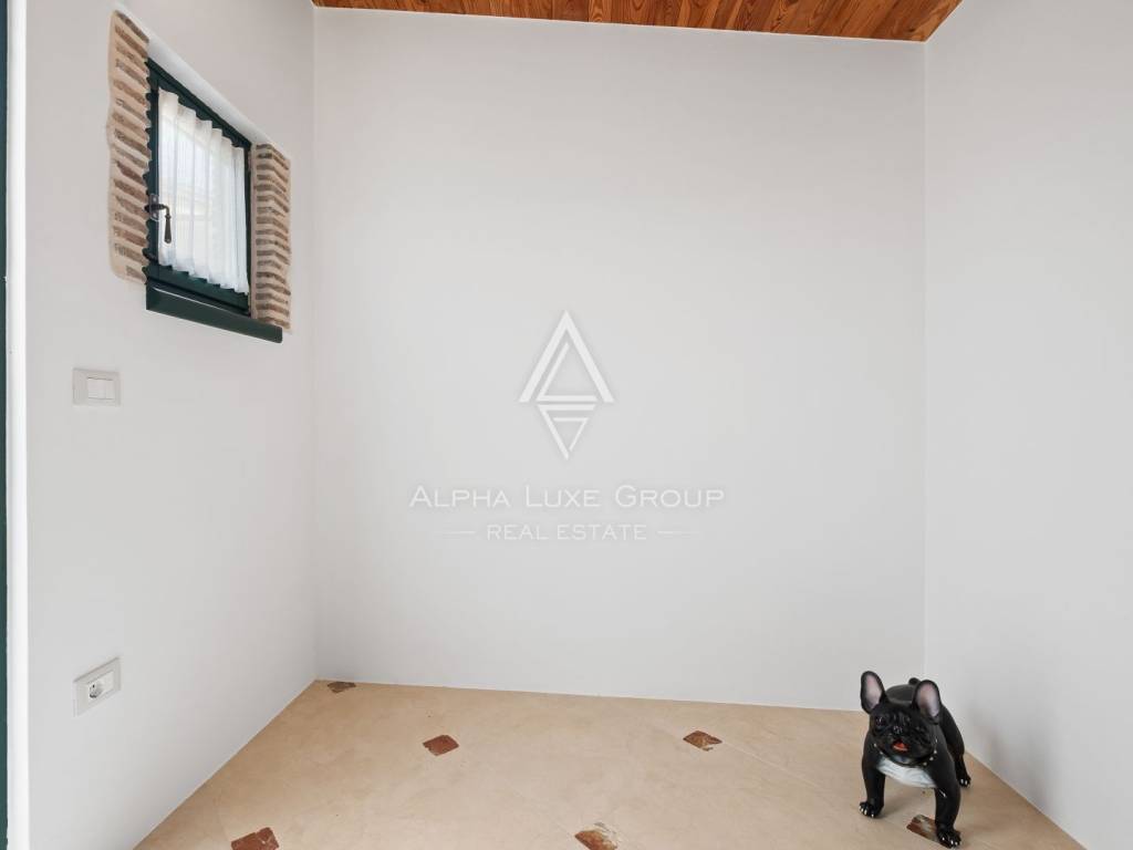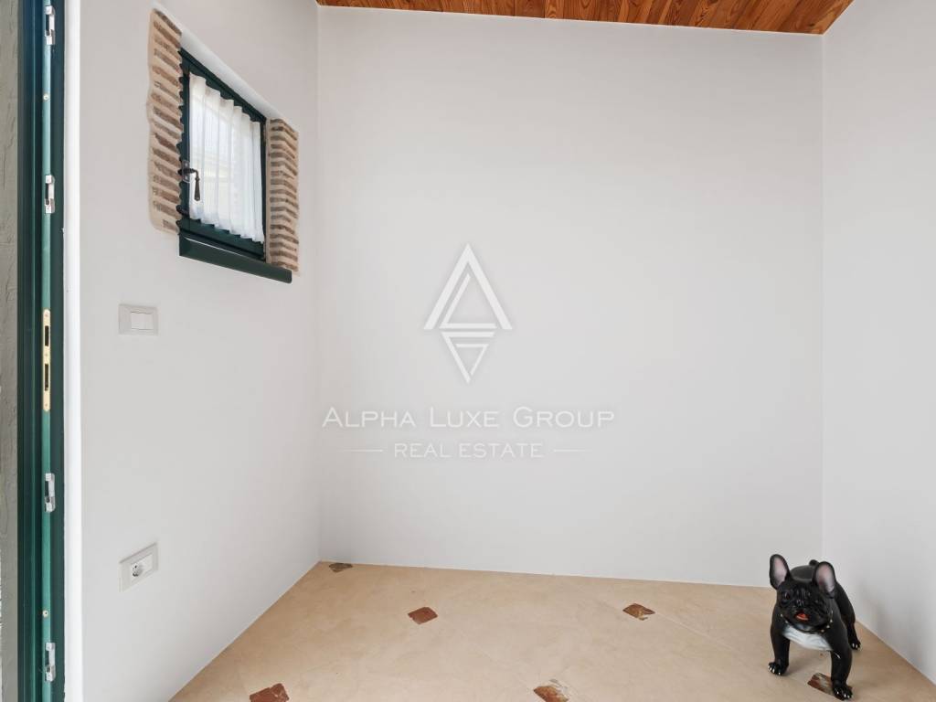 Im Erdgeschoss befinden sich eine moderne Küche mit Ess- und Wohnbereich und direktem Zugang zur Terrasse und zum angelegten Garten sowie ein diskreter Abstell- und Hauswirtschaftsraum unter einer traditionellen Steintreppe. Im Obergeschoss liegen ein komfortables Schlafzimmer mit Terrassenzugang und Blick ins Grüne sowie ein modernes Badezimmer. Im Hof steht zudem ein separates Gartenhaus mit zusätzlichem Schlafzimmer und eigenem Bad, ideal für Gäste oder touristische Vermietung. Heizung und Kühlung erfolgen über Klimaanlage, und das Haus wird nach kompletter Renovierung im Jahr 2015 vollständig möbliert verkauft.