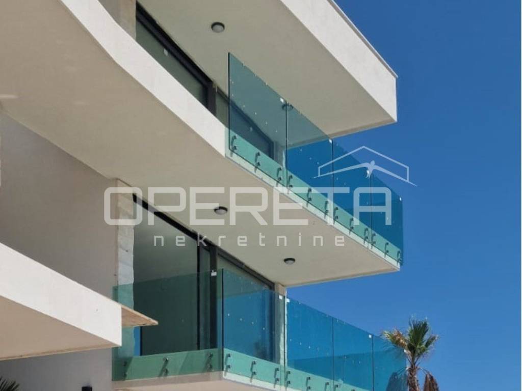 Den zentralen Teil der Wohnung bildet ein imposanter Wohnbereich von über 34 m, in dem Wohnzimmer, Küche und Esszimmer harmonisch ineinander übergehen. Dieses offene Konzept schafft ein Gefühl von Leichtigkeit und Verbundenheit, wobei viel natürliches Licht durch große Glaswände einfällt. Das Wohnzimmer öffnet sich zu einer großzügigen Terrasse, die den Wohnraum nach außen erweitert ein idealer Ort zum Sonnenbaden, Essen im Freien oder zum Entspannen am Abend mit Blick auf das endlose blaue Meer und den nahegelegenen Strand.