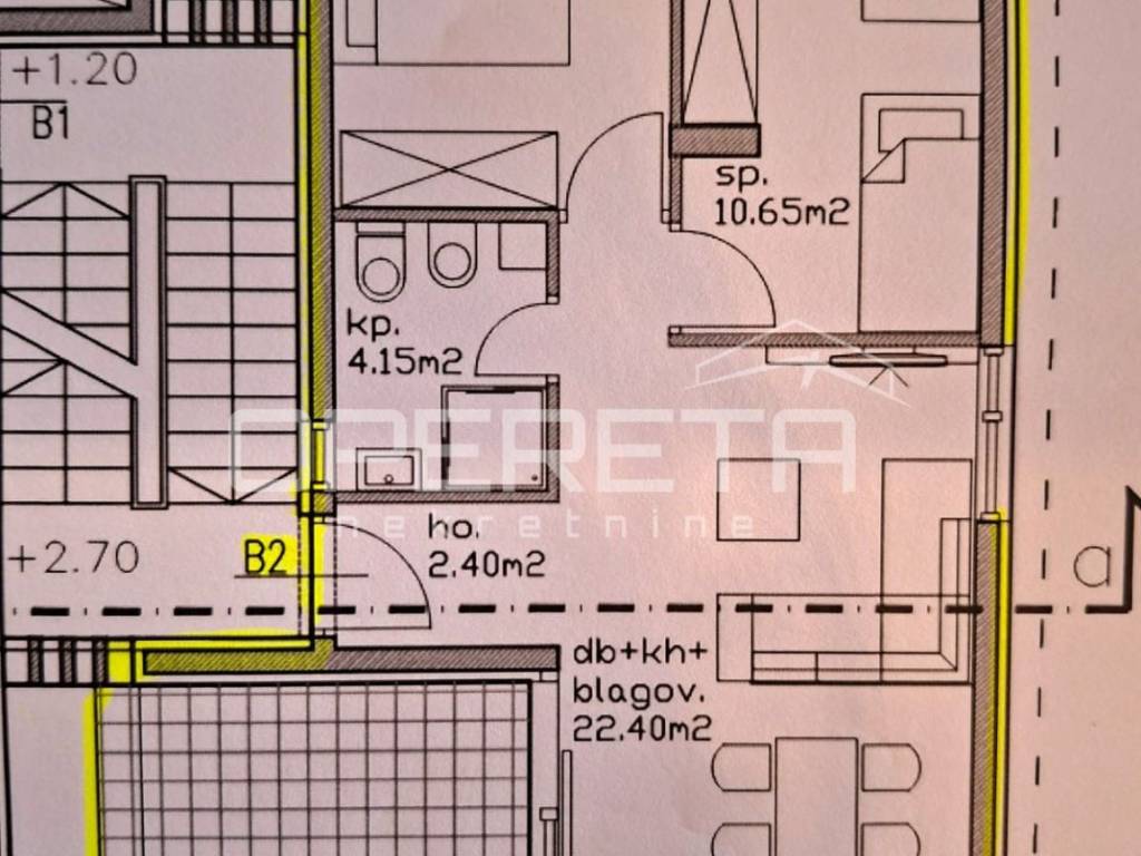 Die Wohnung verfügt über eine Innenfläche von 49,90 m2, eine überdachte Terrasse von 14,40 m2, zwei Parkplätze und einen Abstellraum im Erdgeschoss von 7,55 m2, und nach Berechnung des Koeffizienten verfügt die Wohnung B2 über 72,13 m2.