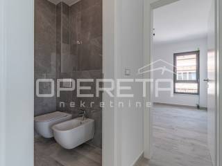Es besteht aus einem Eingangsbereich, einem Badezimmer, zwei Schlafzimmern, einer Küche mit Essbereich, einem Wohnzimmer und einer Loggia.