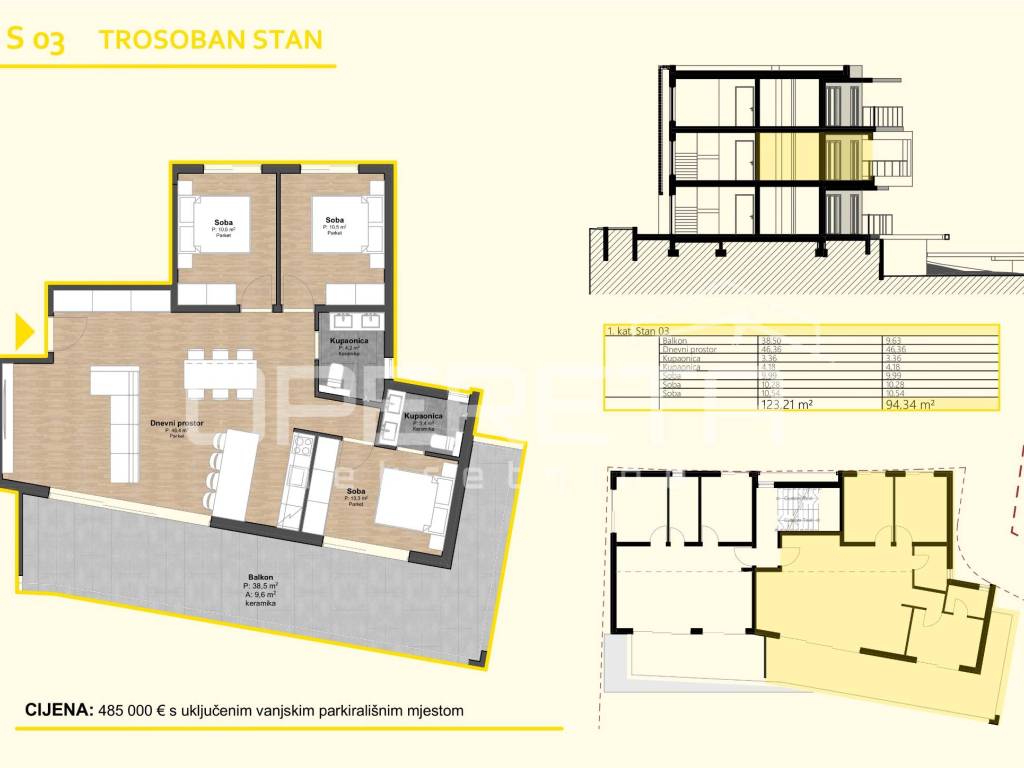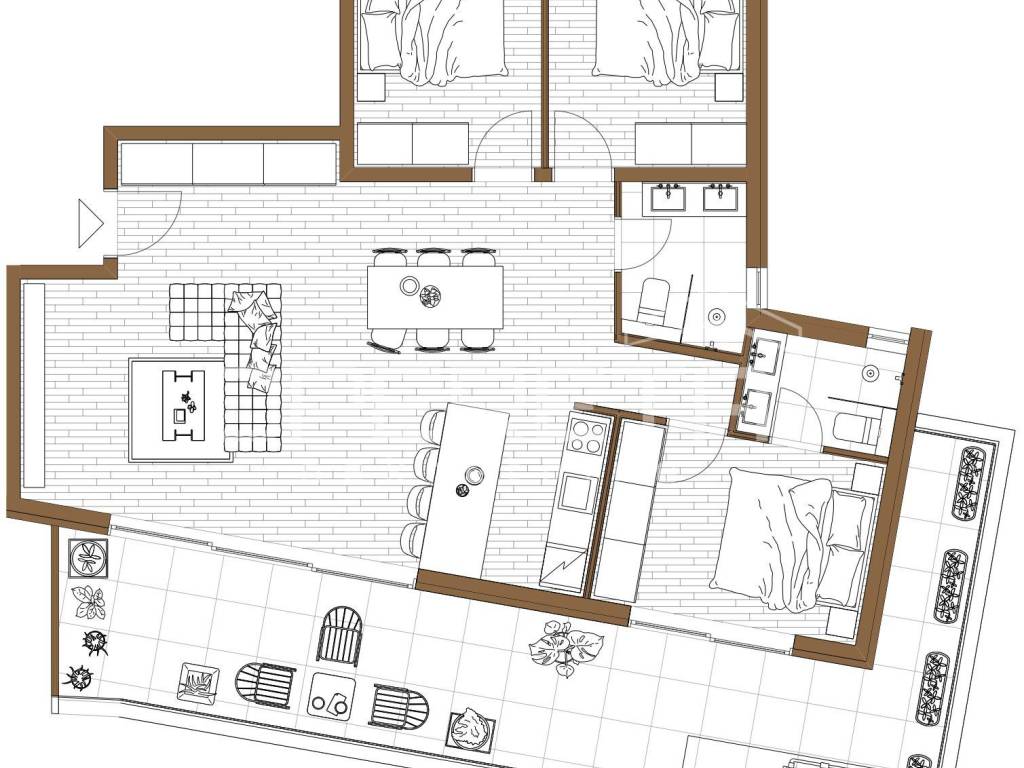 Die Wohnung besteht aus einem großzügigen Wohnbereich mit Küche und Esszimmer von über 45 m, drei Schlafzimmern, zwei Bädern und einer 38 m großen Terrasse. Zur Wohnung gehört ein Außenstellplatz.
