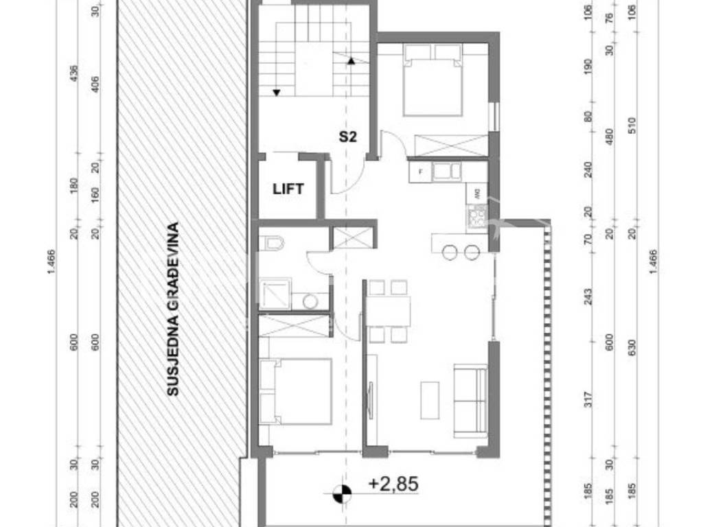 Wohnung S2I (Ost) befindet sich im 1. Stock und besteht aus: Flur 2,27 m, Wohnzimmer mit Küche und Essbereich 26,47 m, Badezimmer 4,29 m, Schlafzimmer 9,64 m, Schlafzimmer 11,40 m.