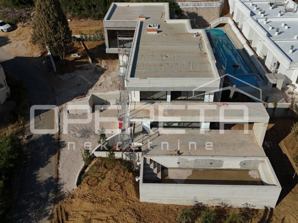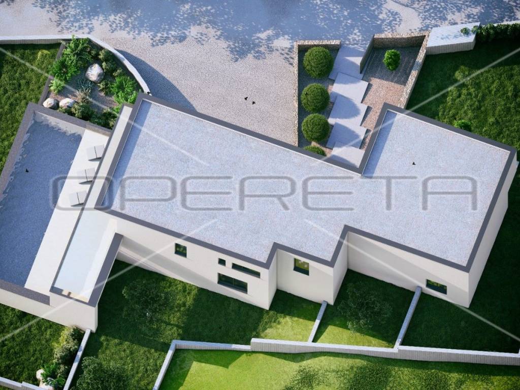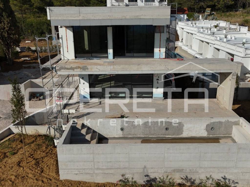 Das Design der Villa kombiniert moderne geometrische Formen mit lokalen Materialien wie Stein und schafft so eine Harmonie zwischen zeitgenössischem Stil und lokaler Tradition. Das Haus besteht aus Wänden, Trägern und Decken aus Stahlbeton, die nach den neuesten Eurocode-Normen für Erdbebensicherheit konstruiert wurden.