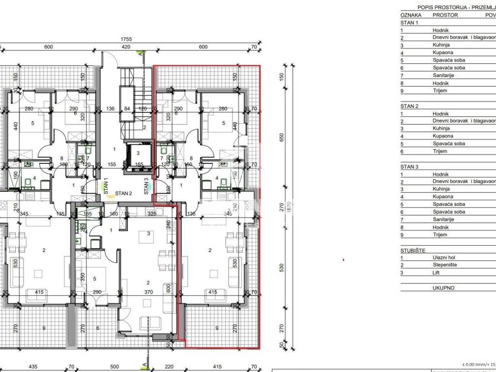 Die Nettonutzfläche der Wohnung beträgt 76,72 m2, während die Fläche des Gartens ca. 60 m2 beträgt. Die Wohnung besteht aus einer Eingangshalle, einem Wohnzimmer mit Küche, 2 Schlafzimmern, einem Badezimmer, einer Toilette und einer großen Terrasse von 16 m2. Die Wohnung verfügt über einen Aufzug und verfügt über einen externen Abstellraum von 3,5 m2 und 2 Parkplätze.