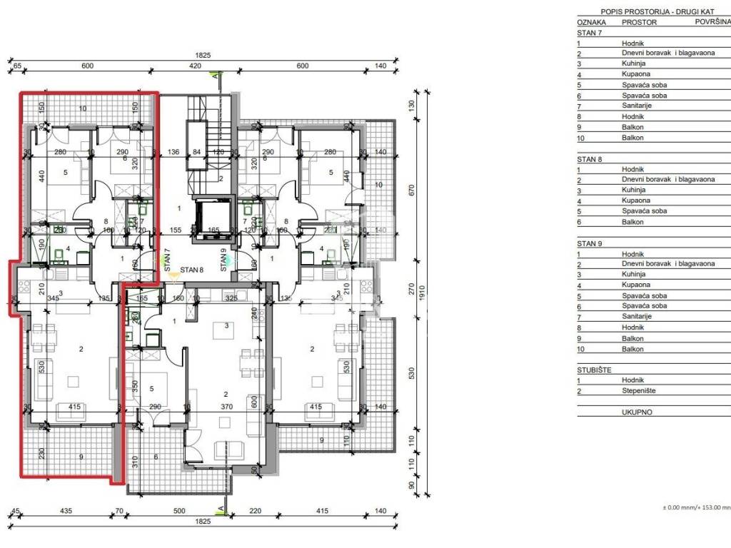 Die Nettonutzfläche der Wohnung beträgt 77,84 m2 und sie befindet sich im zweiten Stock. Es besteht aus einer Eingangshalle, einem Wohnzimmer mit Küche, 2 Schlafzimmern, einem Badezimmer, einer Toilette und 2 Terrassen. Die Wohnung verfügt über einen Aufzug und verfügt über einen externen Abstellraum von 3,5 m2 und 2 Parkplätze.