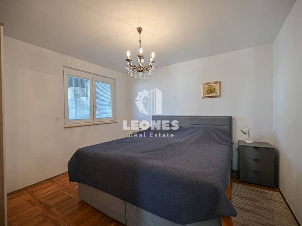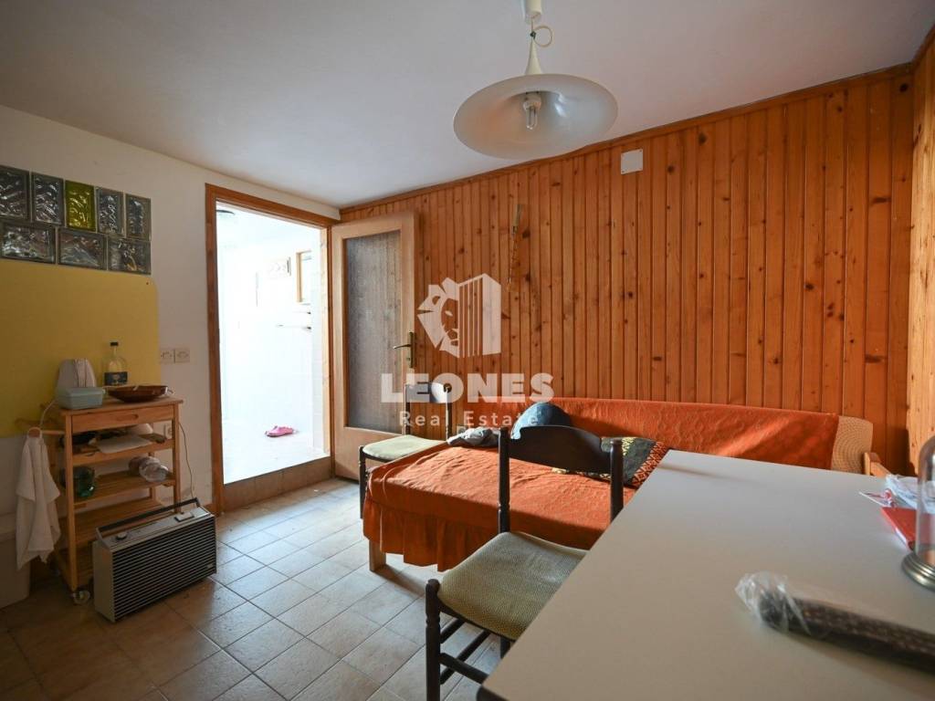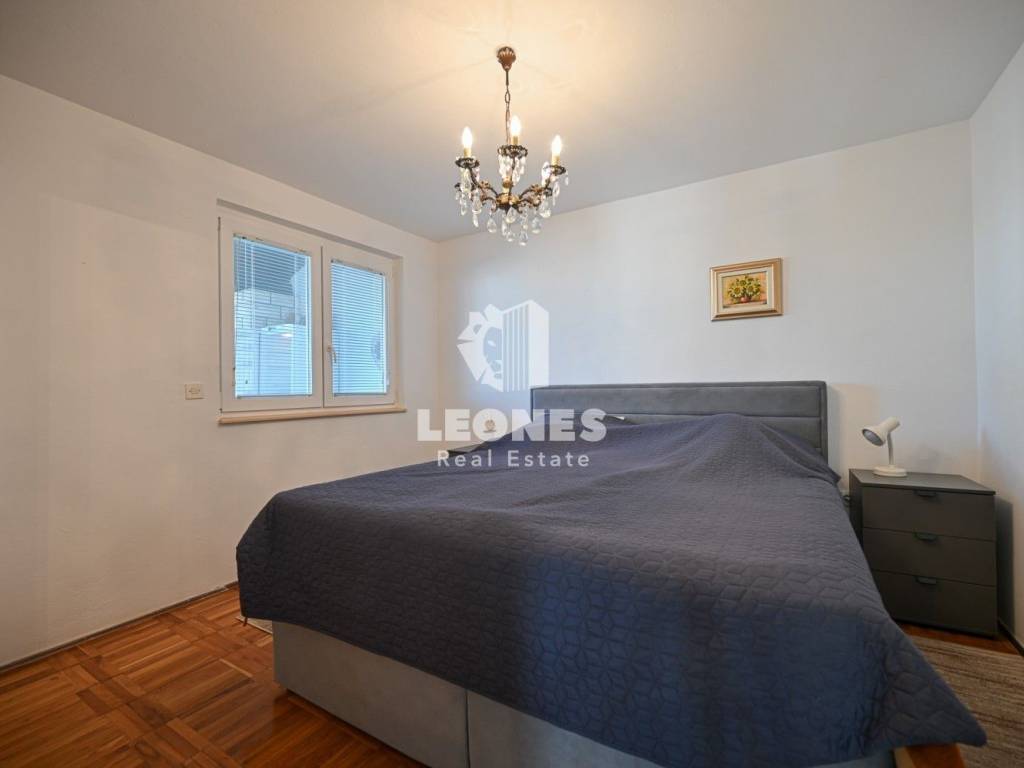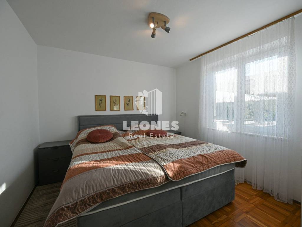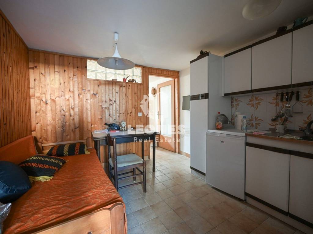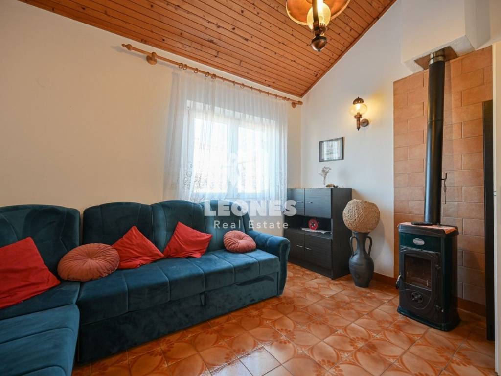 Die Innenausstattung umfasst eine Küche mit Einbaugeräten, einen Fernseher und ein Bett. Für wohlige Wärme sorgen eine elektrische Heizung, eine Klimaanlage und ein Kamin. Zu den weiteren Annehmlichkeiten gehören ein Balkon, ein überdachter Balkon, ein Keller, eine Garage, ein Hof, ein Abstellraum, eine Terrasse und ein Garten. Die Zufahrt erfolgt über eine asphaltierte Straße. Der angelegte Garten trägt zusätzlich zur Ästhetik und Funktionalität des Außenbereichs bei.