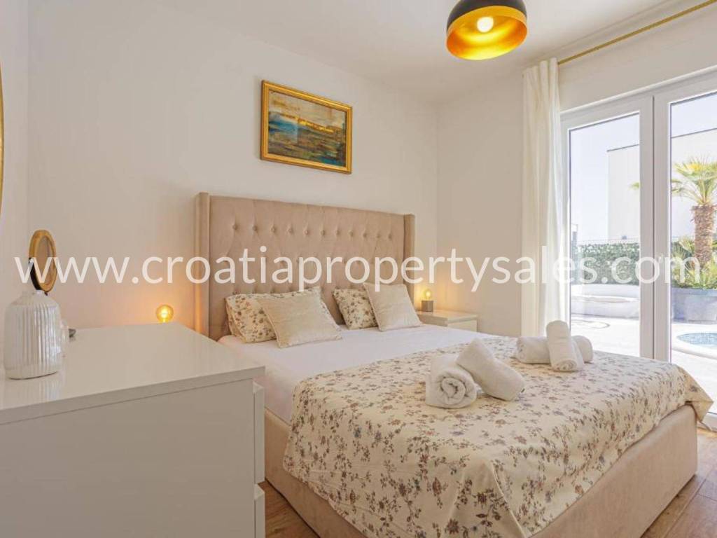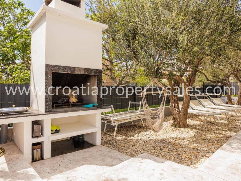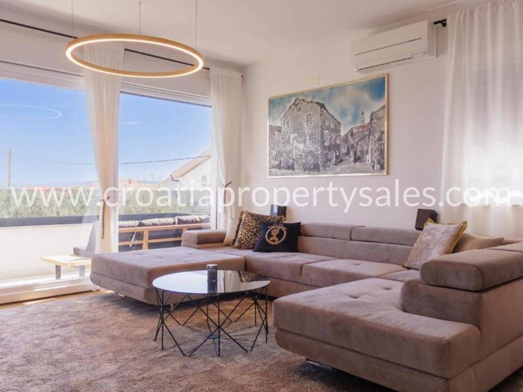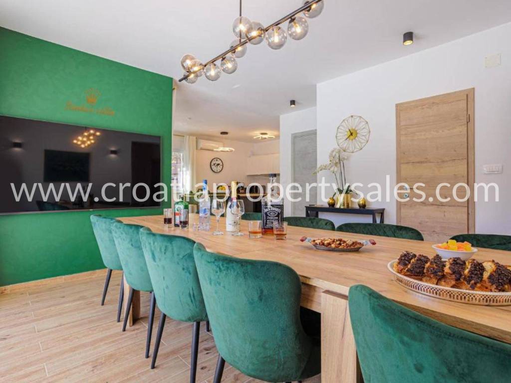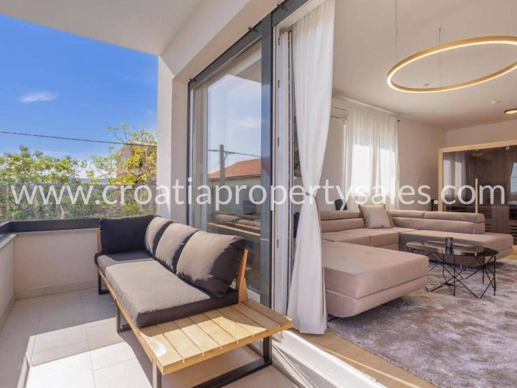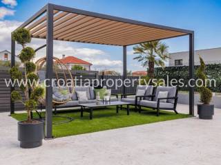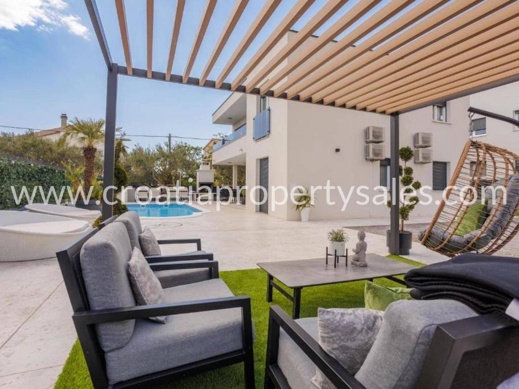 Luxuriöse Villa mit Pool und Meerblick. Sie befindet sich in ruhiger Lage, nur 1 Kilometer vom Meer entfernt. Die Villa erstreckt sich über zwei Etagen und verfügt über fünf Schlafzimmer und vier Badezimmer. Im Erdgeschoss befindet sich ein großzügiges Wohnzimmer mit Küche und Essbereich, von dem aus man Zugang zum Garten, Pool und zur Sonnenterrasse erhält. Im ersten Stock befindet sich eine Terrasse mit Blick auf das Meer und die Bucht von Kaštela. Das Obergeschoss bietet zudem ein weiteres Wohnzimmer mit Infrarotsauna. Zur Villa gehören außerdem ein Parkplatz und eine Ladestation für Elektroautos.