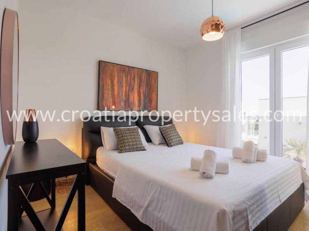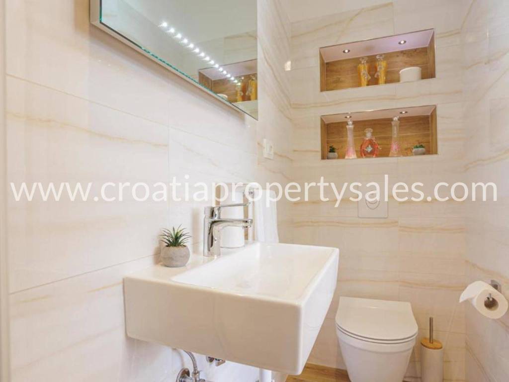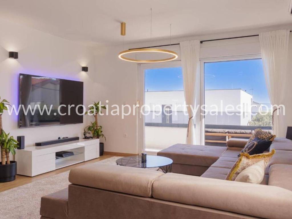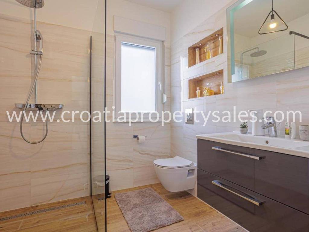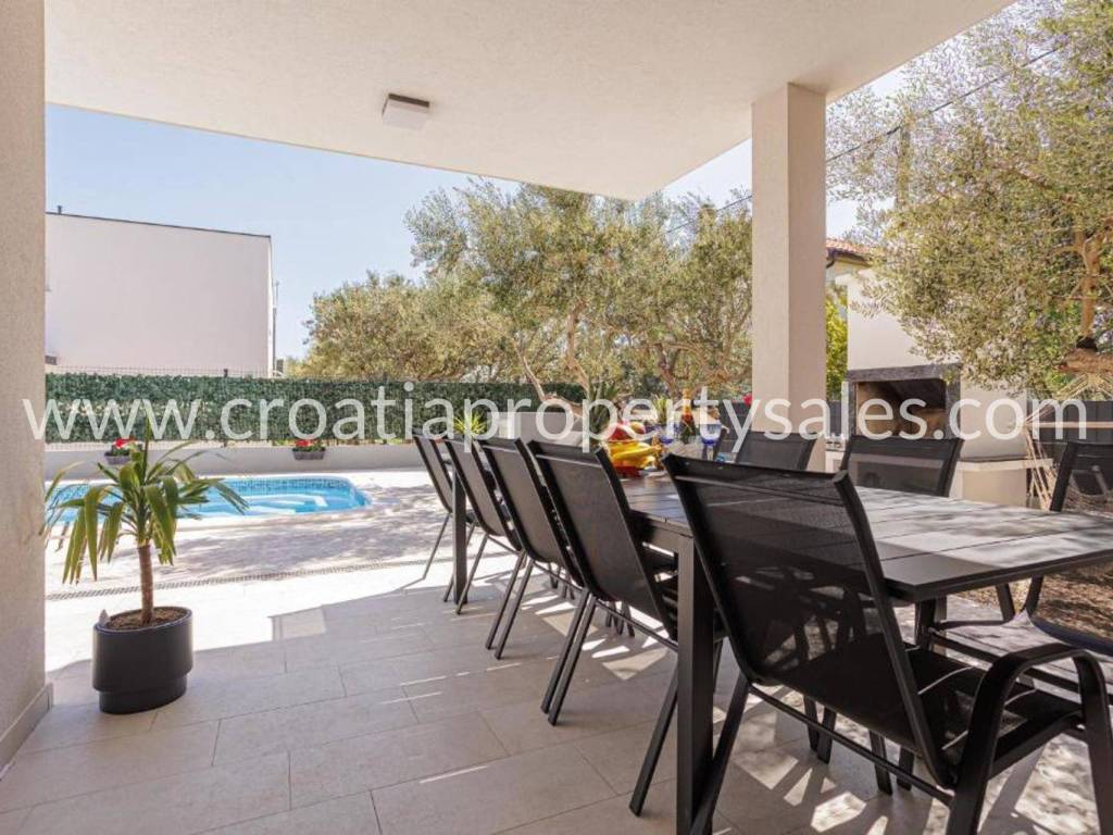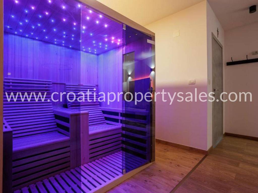 Luxuriöse Villa mit Pool und Meerblick. Sie befindet sich in ruhiger Lage, nur 1 Kilometer vom Meer entfernt. Die Villa erstreckt sich über zwei Etagen und verfügt über fünf Schlafzimmer und vier Badezimmer. Im Erdgeschoss befindet sich ein großzügiges Wohnzimmer mit Küche und Essbereich, von dem aus man Zugang zum Garten, Pool und zur Sonnenterrasse erhält. Im ersten Stock befindet sich eine Terrasse mit Blick auf das Meer und die Bucht von Kaštela. Das Obergeschoss bietet zudem ein weiteres Wohnzimmer mit Infrarotsauna. Zur Villa gehören außerdem ein Parkplatz und eine Ladestation für Elektroautos.