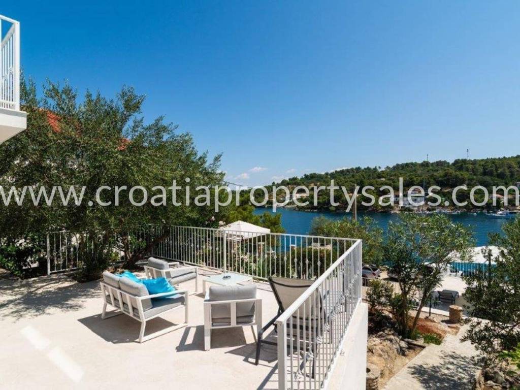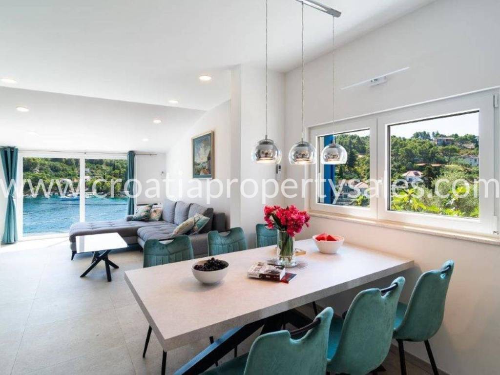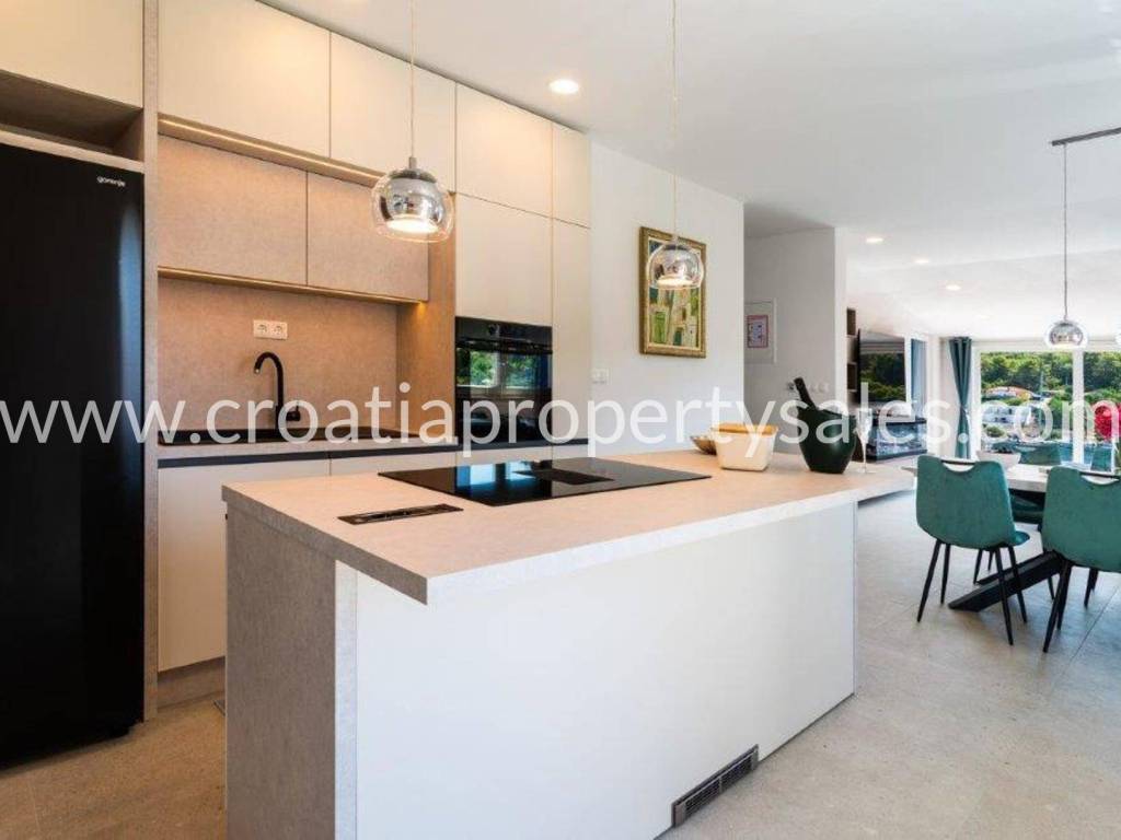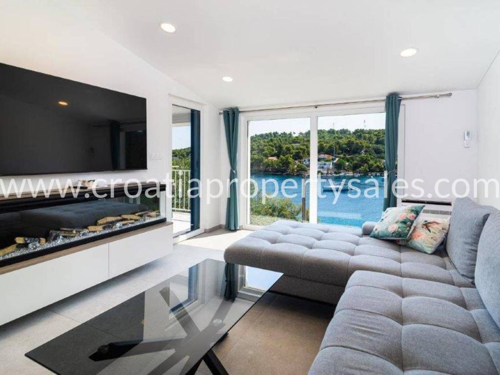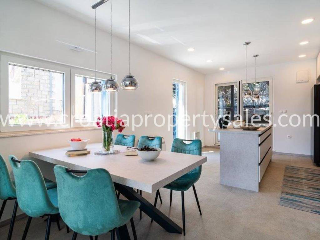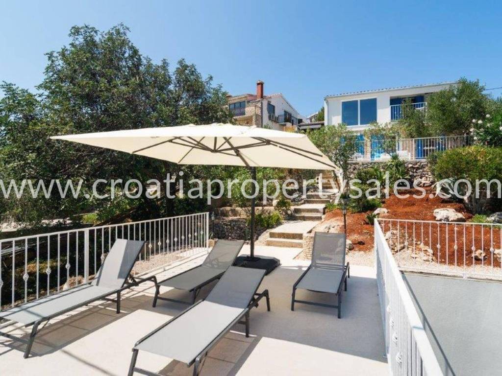 Wunderschönes Luxushaus in erster Reihe zum Meer. Es befindet sich in wunderschöner Lage in einem kleinen malerischen Dorf in der Nähe einer Bucht mit Strand. Das Grundstück ist 522 m2 groß. Das Haus erstreckt sich über zwei Etagen und hat eine Gesamtfläche von 125 m2.Im Erdgeschoss befinden sich ein geräumiges Wohnzimmer, eine Küche mit Esszimmer, ein Flur, zwei Schlafzimmer und zwei Badezimmer. Vom Wohnzimmer aus gelangt man auf die Terrasse mit freiem Meerblick.Im ersten Stock befinden sich ein Schlafzimmer mit Balkon und ein Badezimmer. Der Garten ist reich an mediterranen Pflanzen, eine zusätzliche Terrasse direkt am Meer, ein Außensitzplatz mit Grill, eine Außenküche und eine Dusche. Das gesamte Haus ist luxuriös und modern eingerichtet und erfordert keine zusätzlichen Investitionen. Es wurde 2025 komplett renoviert (Innen- und Außenrenovierung), alle Installationen wurden ausgetauscht, eine Fußbodenheizung wurde installiert, und auch die Möbel und Haushaltsgeräte sind neu. Vor dem Haus führt eine Treppe direkt zum Meer. Das Haus verfügt über eine Autozufahrt und zwei Stellplätze (eine Garage 20 m2). Es liegt nur wenige Gehminuten vom Zentrum der Kleinstadt entfernt.
