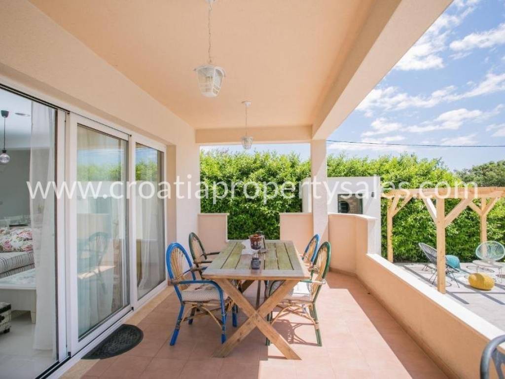 Das Haus verfügt über eine sehr charmante Terrasse mit Pergola, Gartenmöbeln und einem großen Liegestuhl. Die Balkontüren sind mit dreischichtigem Isolierglas ausgestattet, alle Öffnungen sind mit Moskitonetzen ausgestattet, und das gesamte Gebäude verfügt über eine Fußbodenheizung, die für jeden Raum separat geregelt werden kann.