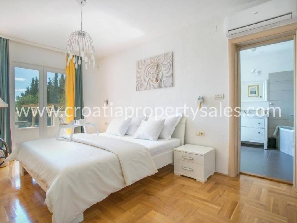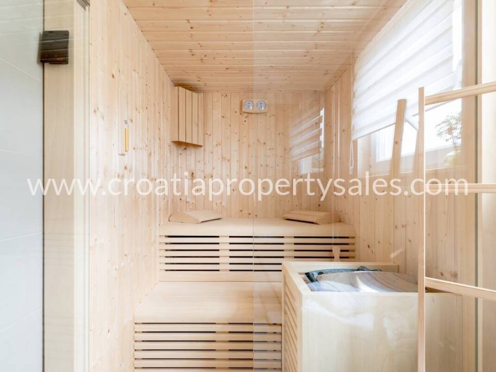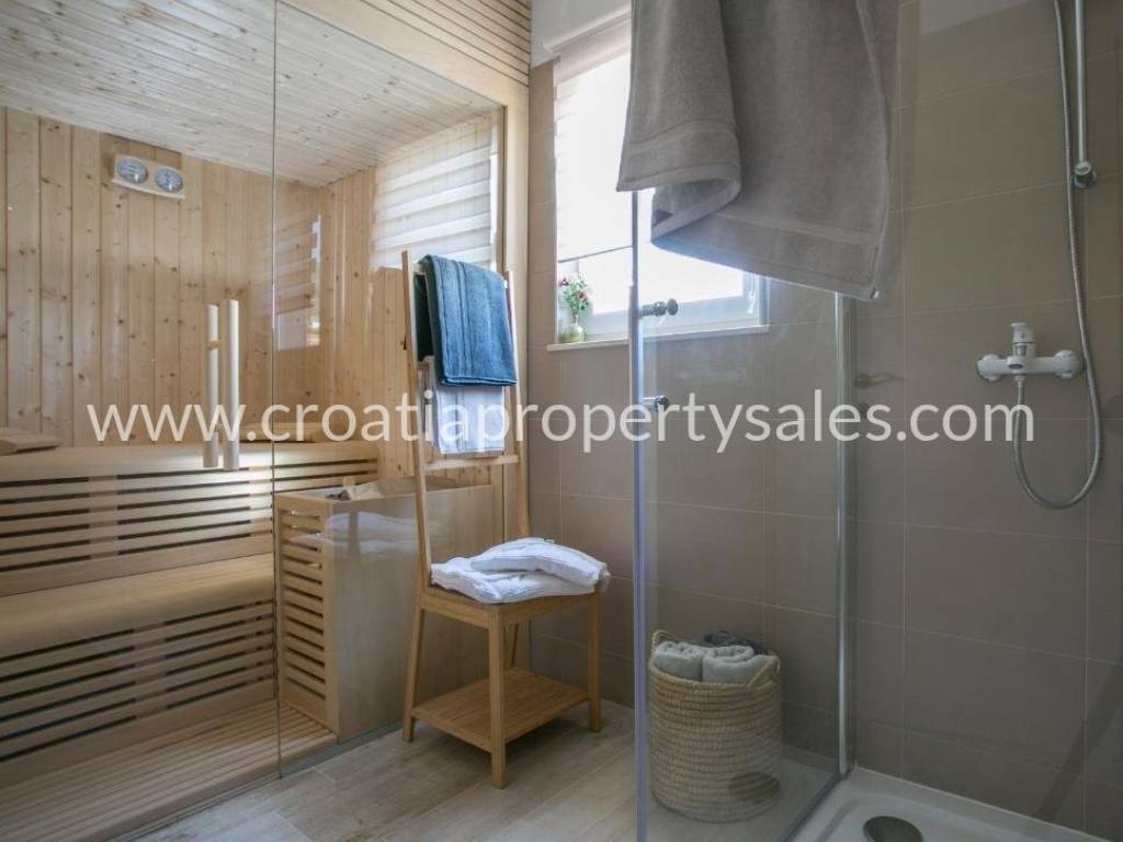 Das Obergeschoss besteht aus einem charmanten Wohnzimmer, einer Küche, einem Esszimmer, einem großen Schlafzimmer, einem Badezimmer mit Sauna, einem Flur und einer offenen Terrasse mit fantastischem Blick auf das Meer und die umliegenden Inseln.