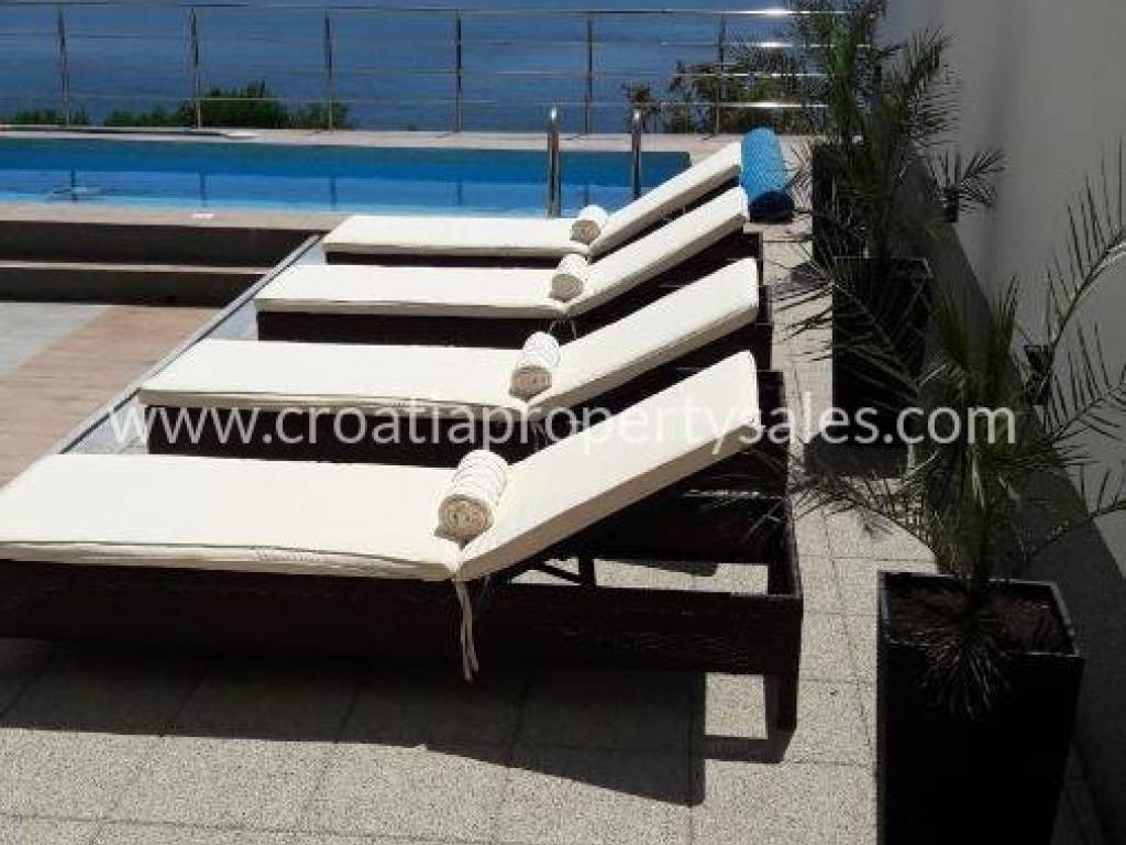 Im Erdgeschoss befindet sich eine geräumige Dreizimmerwohnung mit direktem Zugang zur Terrasse mit Swimmingpool, Solarium, Grill und Außenbereich zum geselligen Beisammensein.