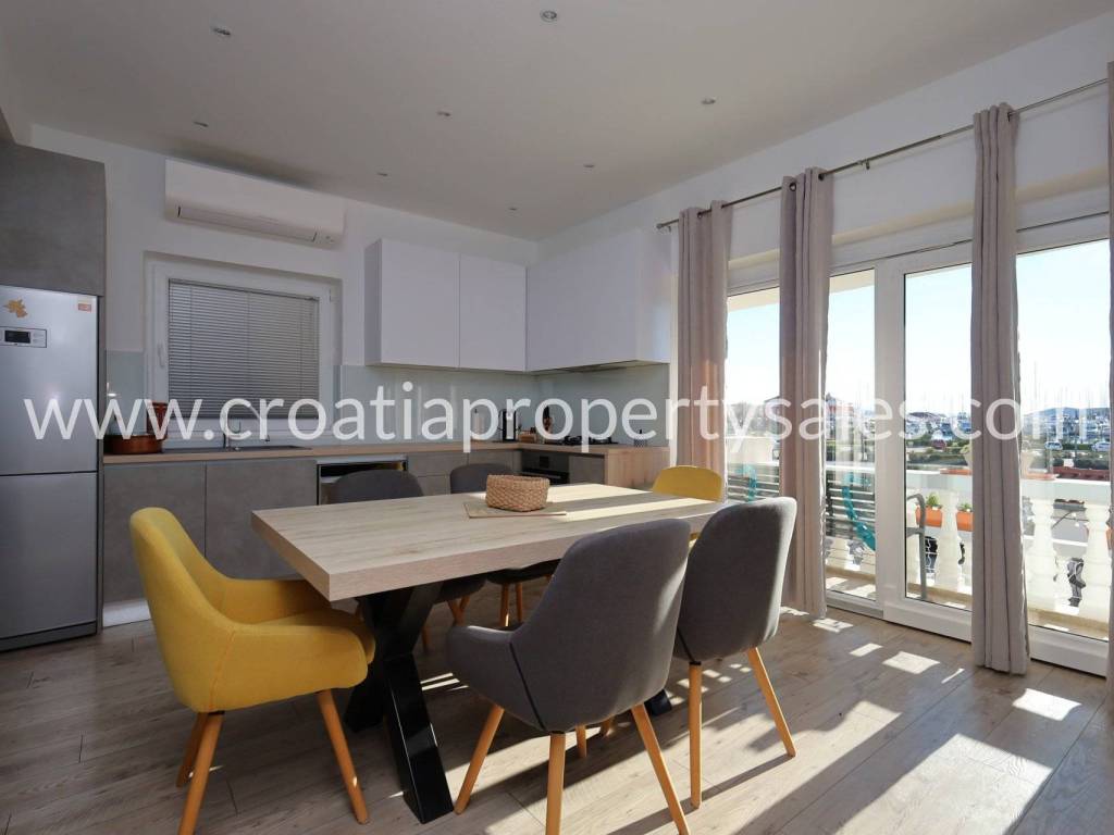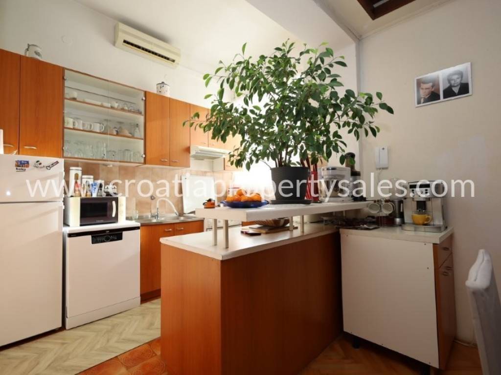 Im ersten Stock befindet sich eine zweistöckige Wohnung bestehend aus einem geräumigen Wohnzimmer mit Küche und Esszimmer, 3 Schlafzimmern, 2 Bädern, einer schönen Terrasse mit Blick aufs Meer, einem kleinen Wohnzimmer im zweiten Stock und einer kleinen Terrasse im zweiten Stock, ebenfalls mit Meerblick.