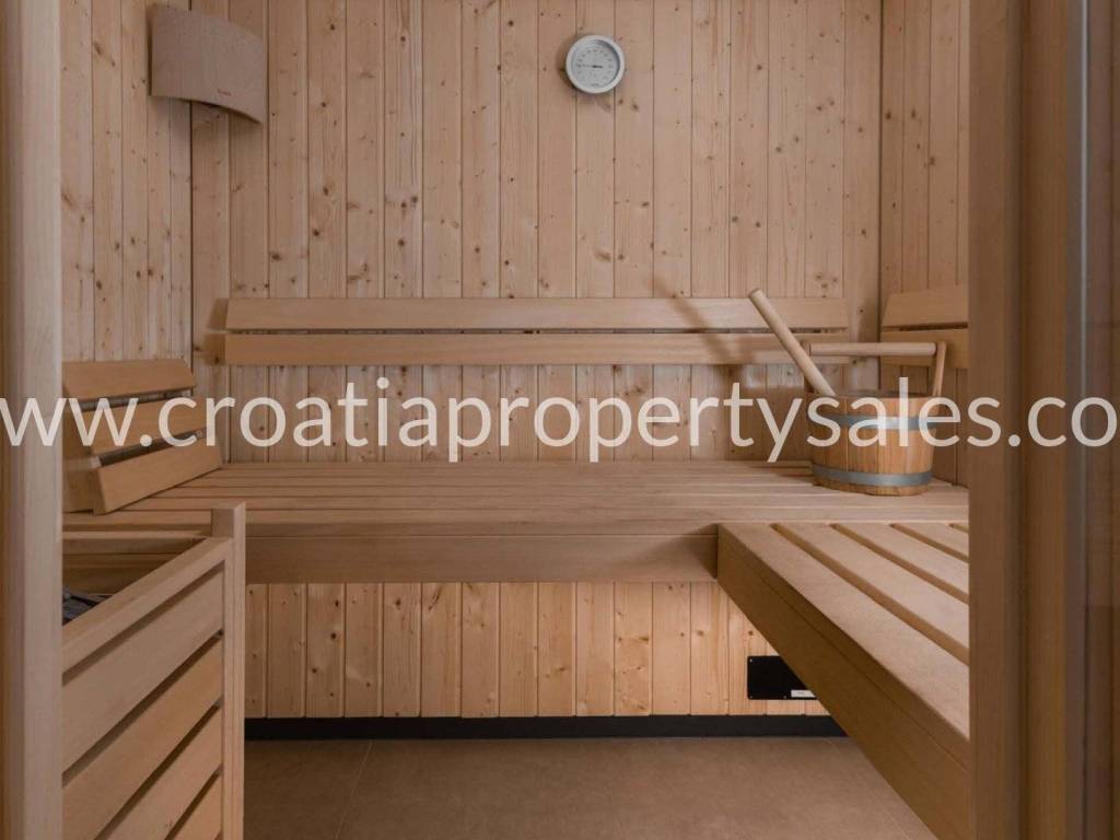 Im Keller der Villa gibt es einen Raum mit Fitnessraum, Sauna, Taverne, Badezimmer und Abstellraum.