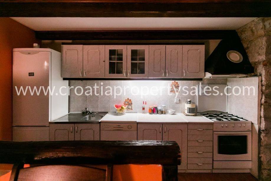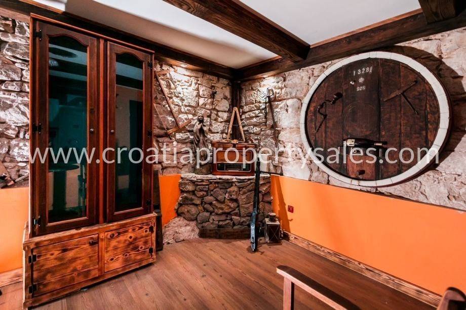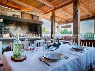 Das Haus hat zwei Eingänge, so dass es möglich ist, die Etagen zu trennen, je nach Wunsch des zukünftigen Eigentümers. Im ersten Stock befindet sich eine Taverne mit Eingang auf der Nordseite, wo sich Küche, Esszimmer, Wohnzimmer und Toilette befinden.Vor der Taverne befindet sich eine schöne Terrasse von 35 m2 mit einem Kamin, einem gemauerten Waschbecken und einer Arbeitsfläche.