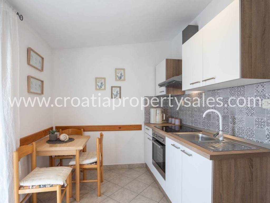 Im ersten Stock des Hauses befindet sich eine geräumige, komplett eingerichtete Zweizimmerwohnung, die aus einem Flur, zwei Schlafzimmern, einem Badezimmer, einer Küche, einem Esszimmer und einem Wohnzimmer mit einem Holzkamin zum Heizen besteht der Winter.
