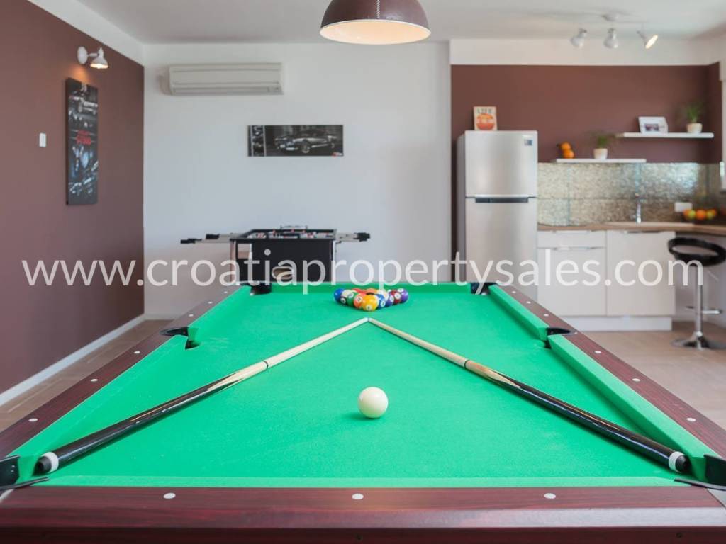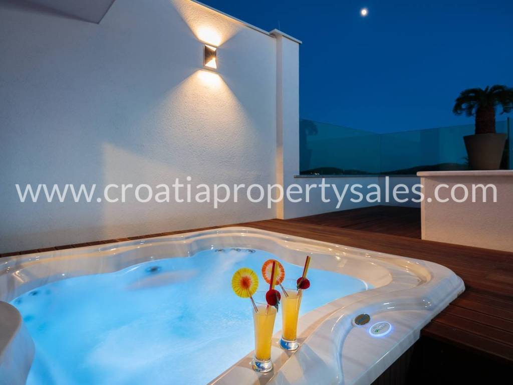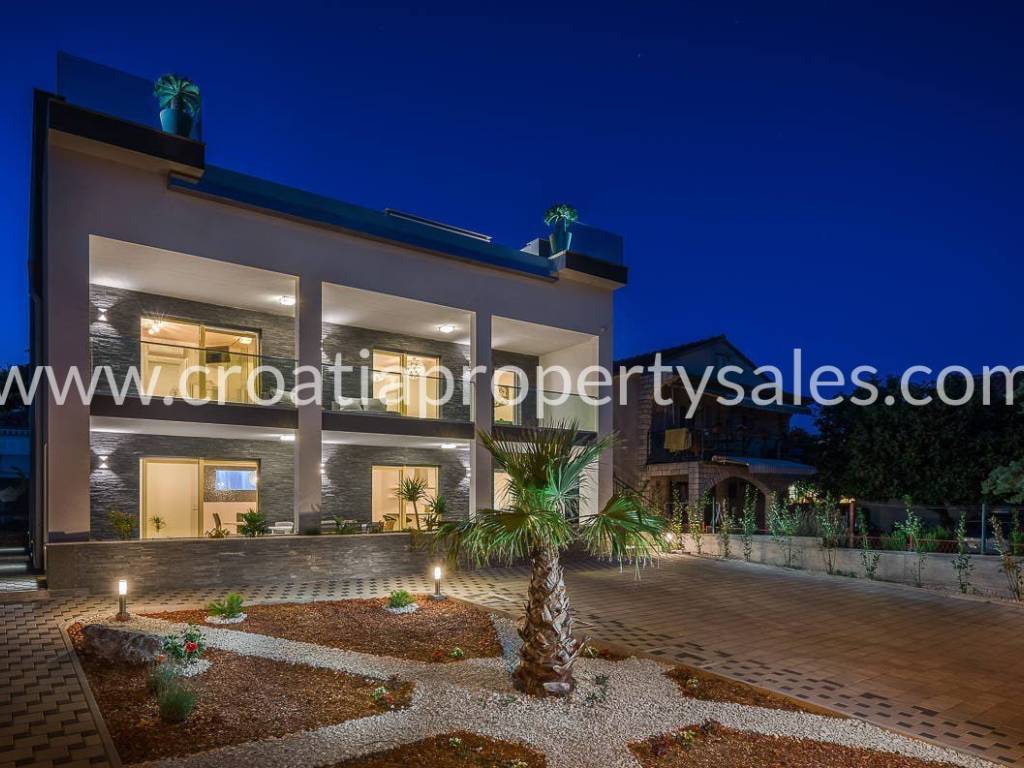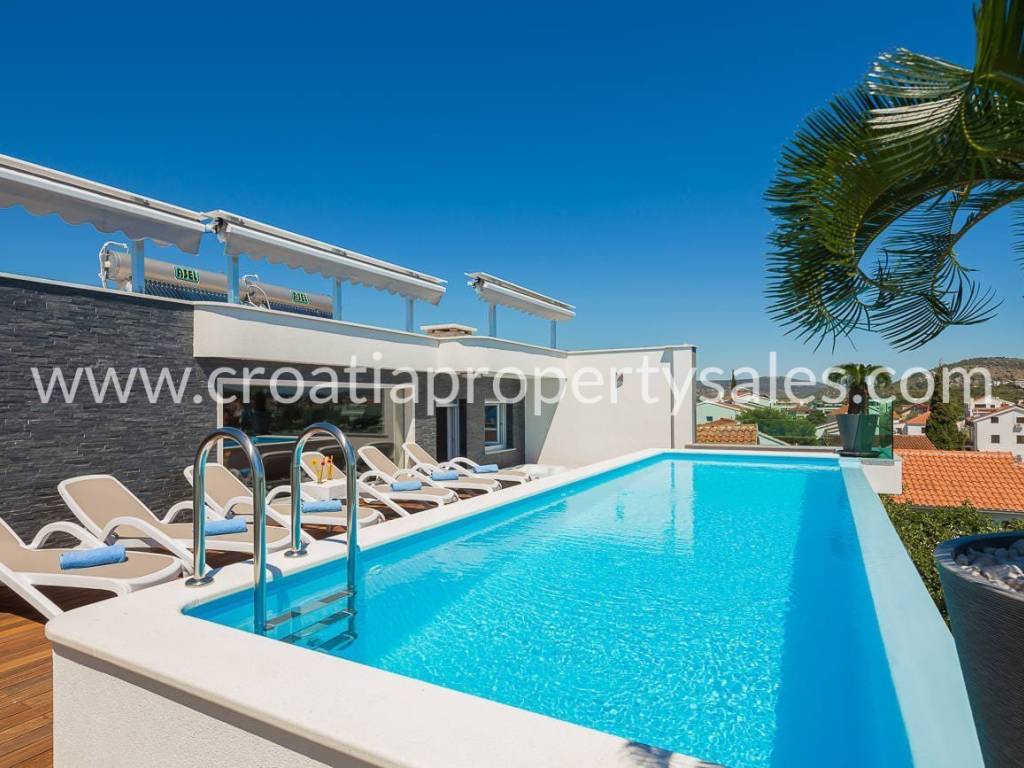 Schöne Villa mit Pool auf dem Dach und Terrasse, nur wenige Gehminuten vom Strand entfernt. Die Villa hat eine Bruttofläche von 410 m2 und befindet sich auf einem Grundstück von 460 m2. Die Villa ist komplett eingerichtet und ausgestattet und besteht aus einem Wohnzimmer mit Küche und fünf Schlafzimmern mit Badezimmern. Von der Dachterrasse mit Swimmingpool von 7,8 m2 x 2,8 m2 hat man einen schönen Blick auf das Meer und die Umgebung. Parkplätze sind im Garten vorhanden.