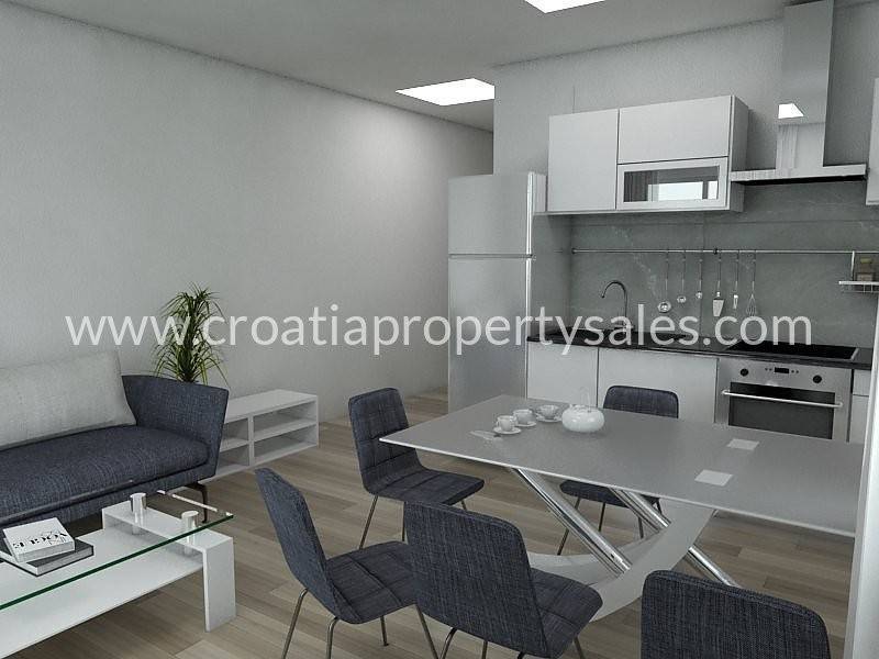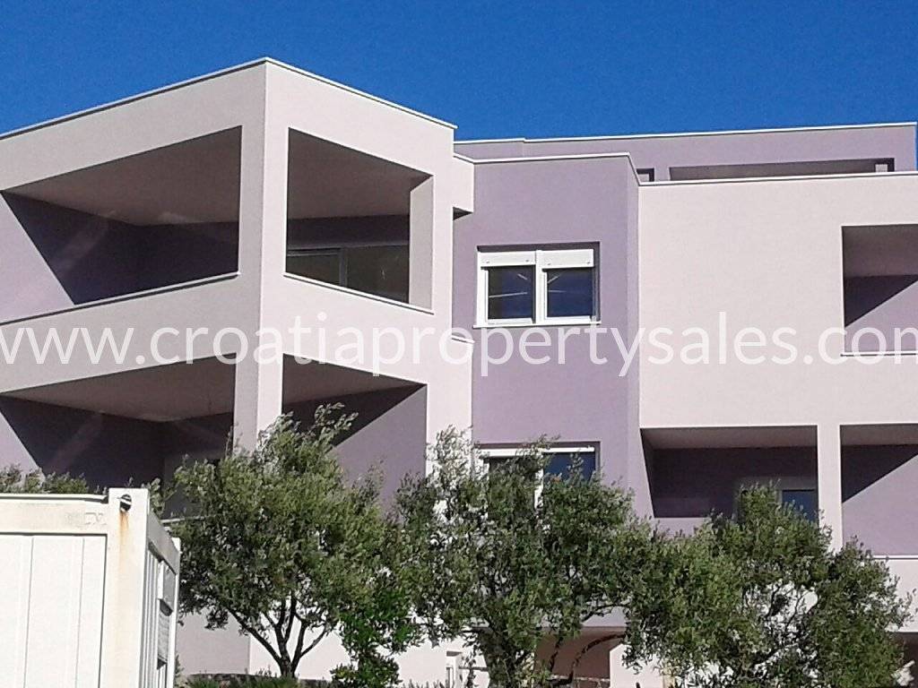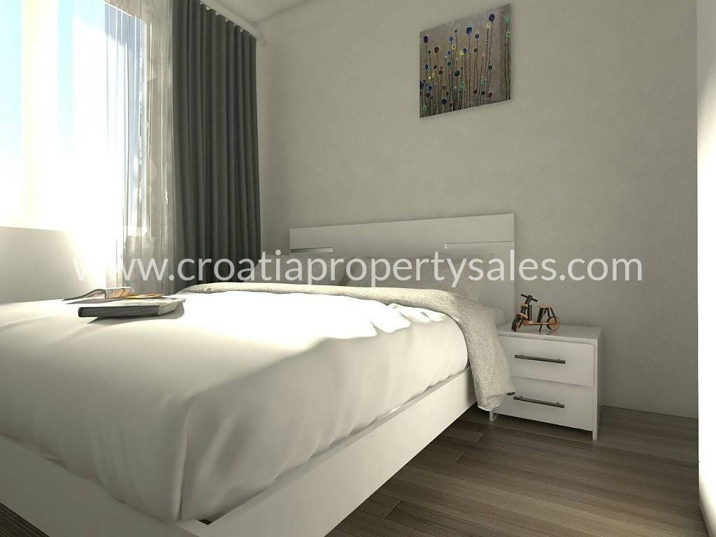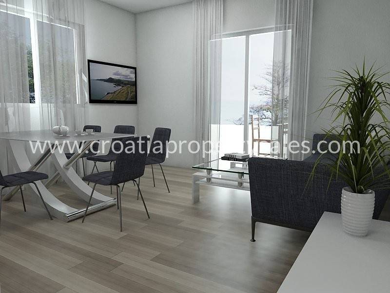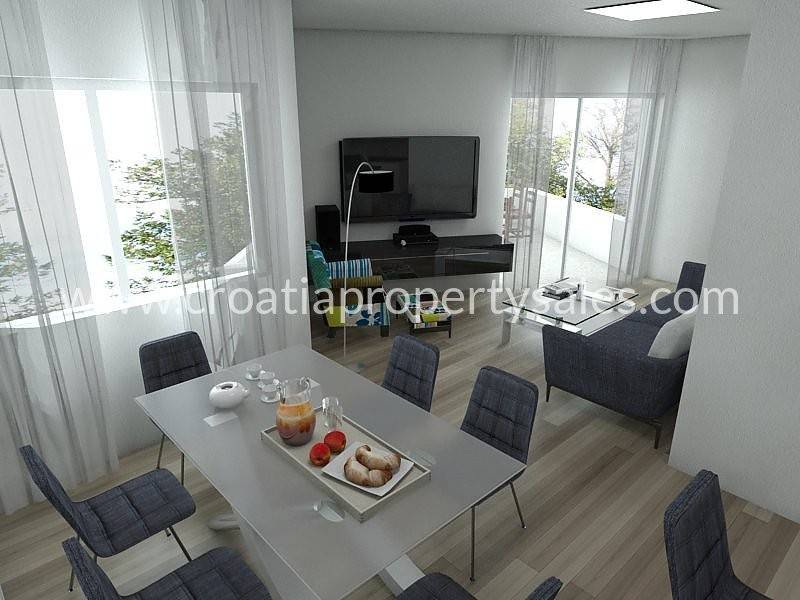 Im zweiten Stock befindet sich ein geräumiges und helles 3-Zimmer-Apartment mit einer großen Balkonfläche von 30 m2 und bietet einen schönen Blick auf das Meer und die Bucht.