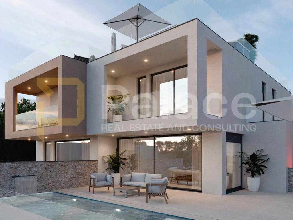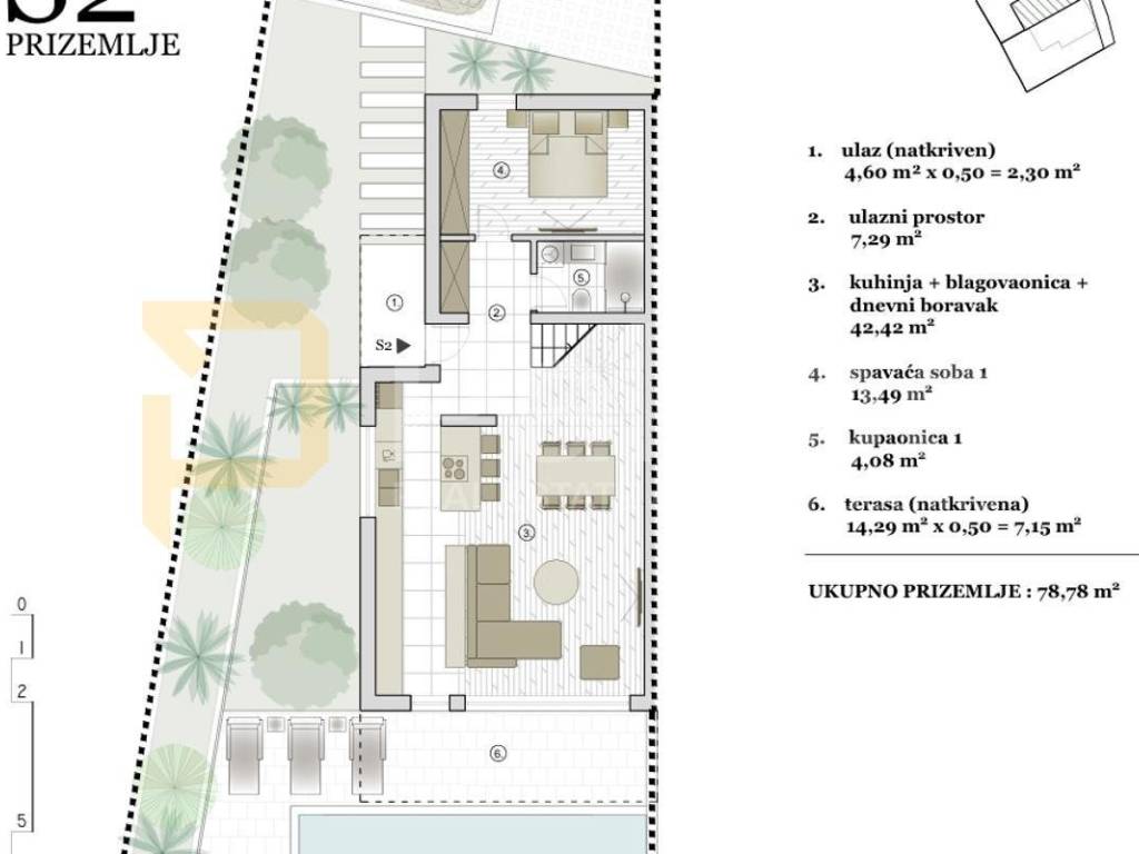 Wohnung S2, insgesamt 224,73 m2 Nettofläche, erstreckt sich über zwei Etagen. Die Gesamtwohnfläche inklusive der Terrassen beträgt 185 m2. Im Erdgeschoss mit einer Größe von 78,78 m2 befinden sich die Küche mit Essbereich, ein großes Wohnzimmer, ein Schlafzimmer, ein Ankleidezimmer und ein Badezimmer. Vom Wohnzimmer gelangt man in den wunderschönen Garten mit überdachter Terrasse und Pool.