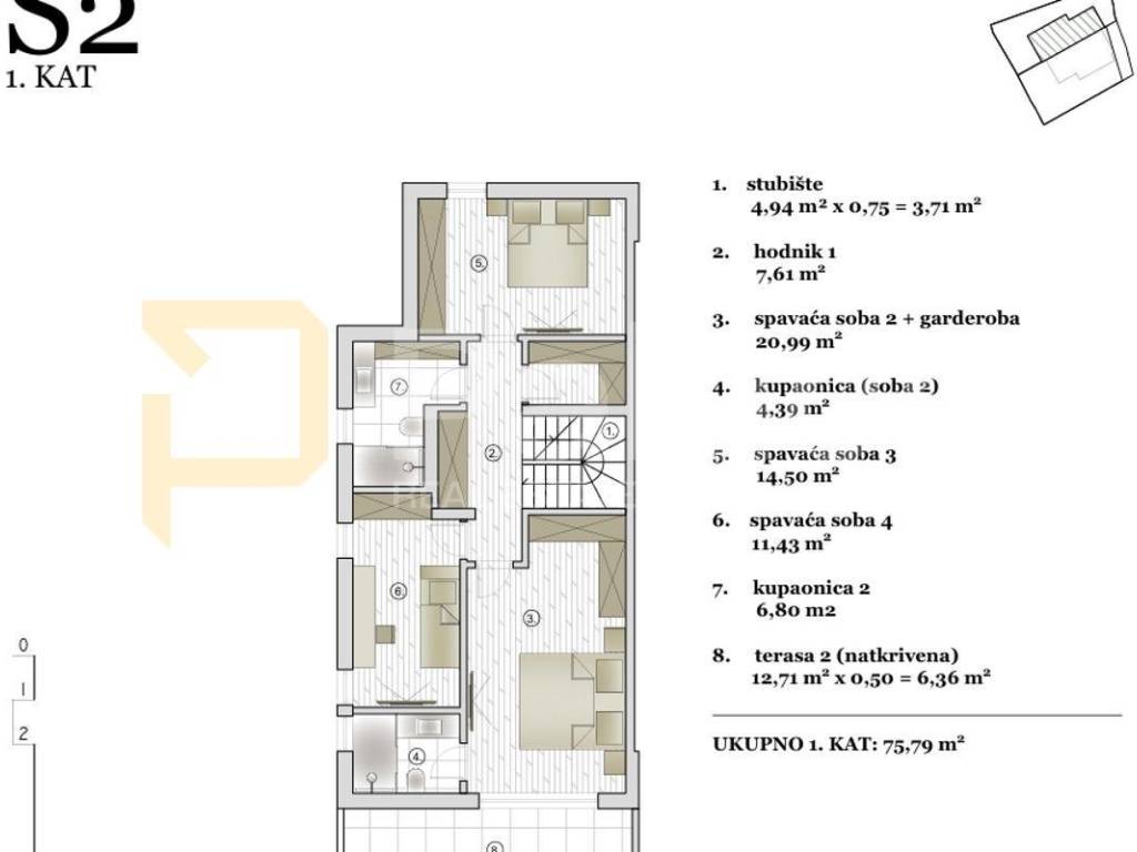 Über eine Innentreppe erreicht man den ersten Stock mit einer Fläche von 75,79 m2, wo sich drei Schlafzimmer und Badezimmer befinden. Das Hauptschlafzimmer mit eigenem Badezimmer hat Zugang zu einer großzügigen überdachten Außenterrasse. Im ersten Stock befinden sich außerdem zwei weitere Schlafzimmer mit eigenem Badezimmer und Ankleidezimmer.