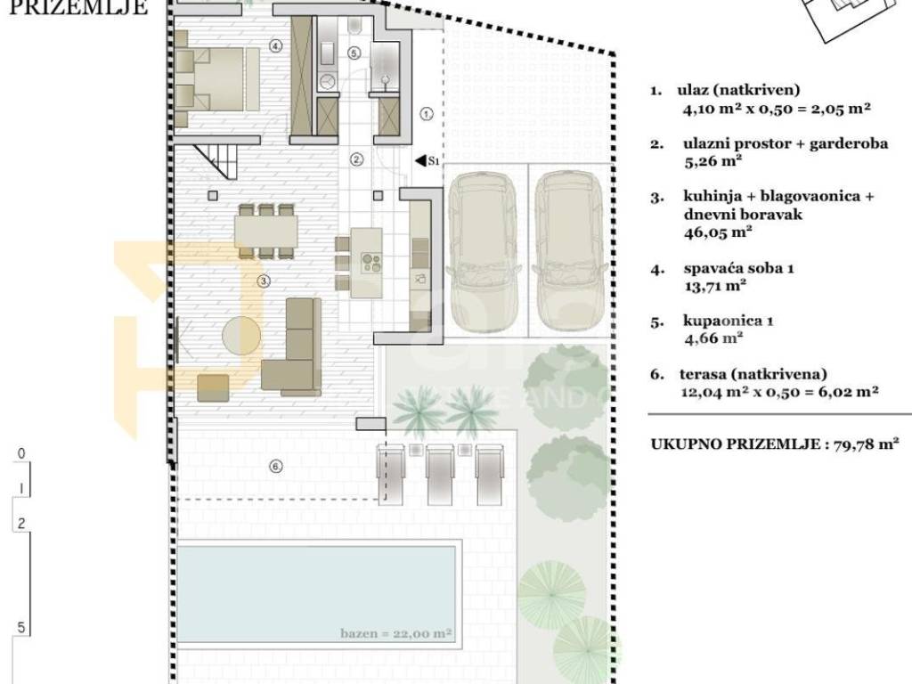 Wohnung S1, Gesamtnettofläche 217,90 m2, erstreckt sich über zwei Etagen. Die Gesamtwohnfläche inklusive der dazugehörigen Terrassen beträgt 175 m2. Im Erdgeschoss mit einer Fläche von 78,79 m2 befinden sich eine Küche mit Esszimmer, ein großes Wohnzimmer, ein Schlafzimmer, ein Ankleidezimmer und ein Badezimmer. Vom Wohnzimmer aus gelangt man in den wunderschönen Garten mit überdachter Terrasse und Pool.