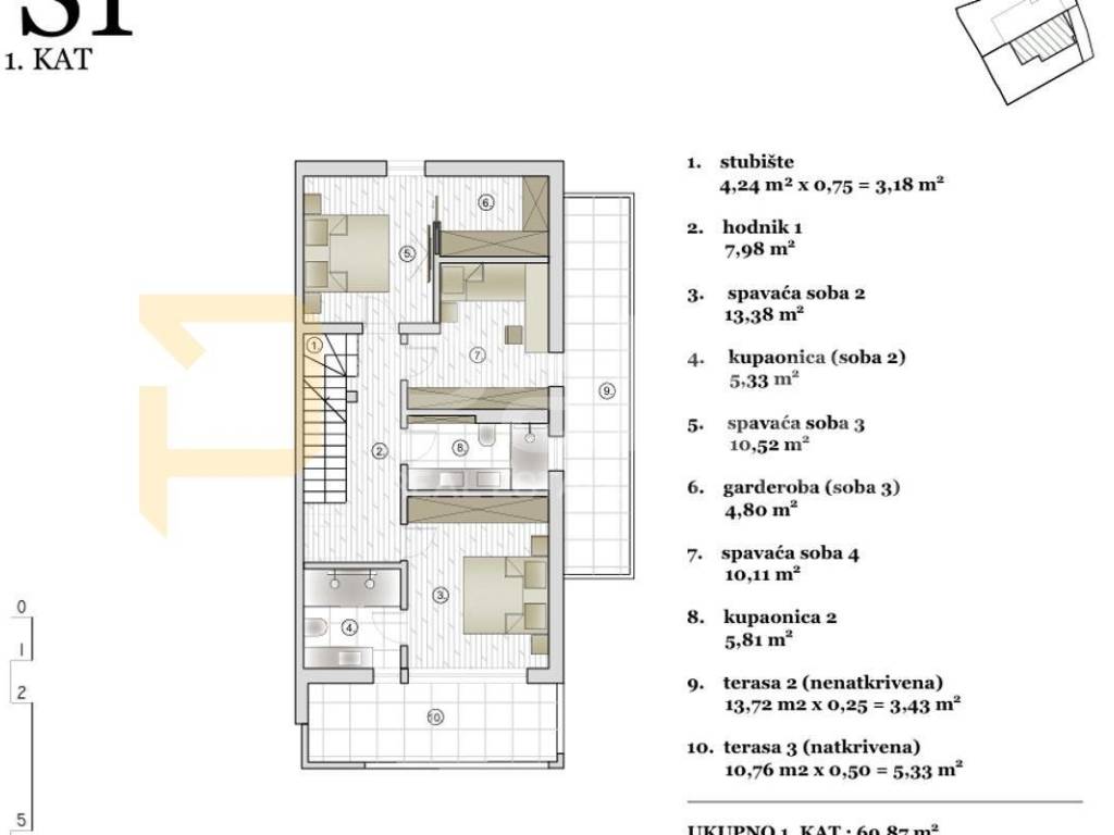 Über eine Innentreppe gelangt man zum Obergeschoss mit einer Fläche von 69,87 m2, auf dem sich drei Schlafzimmer und Badezimmer befinden. Das Hauptschlafzimmer mit Badezimmer hat Zugang zu einer geräumigen überdachten Außenterrasse. Im Obergeschoss befinden sich zwei weitere Schlafzimmer und ein Badezimmer, jeweils mit eigenem Ankleidezimmer, wobei ein Schlafzimmer Zugang zu einer nicht überdachten Außenterrasse hat.