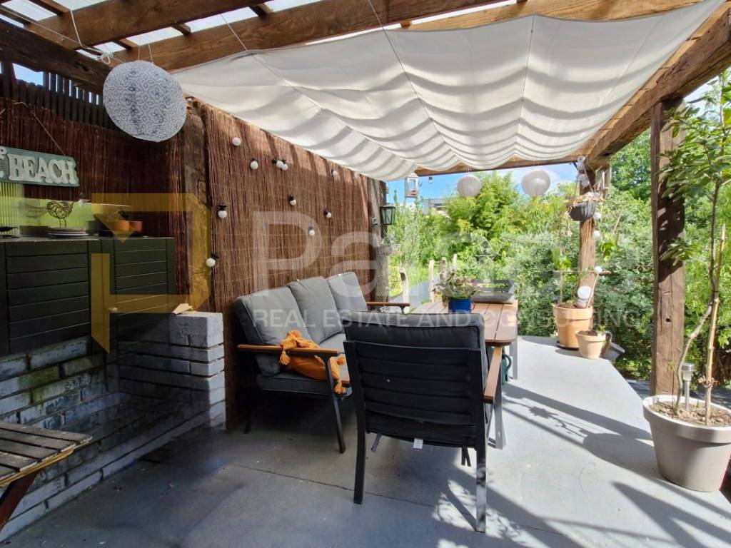 Erdgeschoss: Wohnzimmer, Küche mit Essbereich (Zugang zur überdachten Terrasse und zum Hof mit gemauertem Grill), Badezimmer, kleines Zimmer