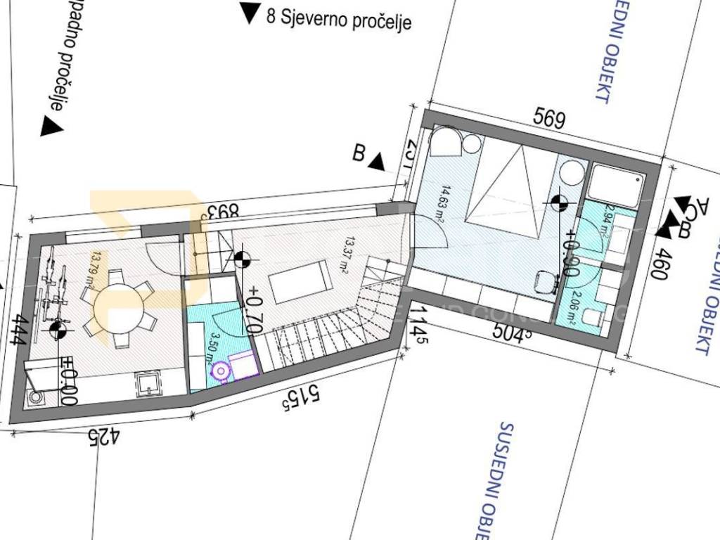 Zum Verkauf steht ein Baugrundstück mit einem fertigen Projekt für ein neues Haus mit 3 Etagen und einer Gesamtnettofläche von 160 m2 in Šibenik, in der Gegend Crnica, in der Nähe des Strandes Banj und der Festung St. Michael.