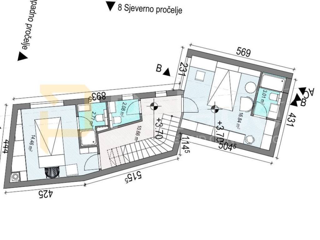 - erste Etage: Schlafzimmer 14,46 m2, Badezimmer 2,77 m2, Flur mit Treppe 10,66 m2, WC 2,08 m2, Schlafzimmer 16,84 m2, Badezimmer 3,01 m2