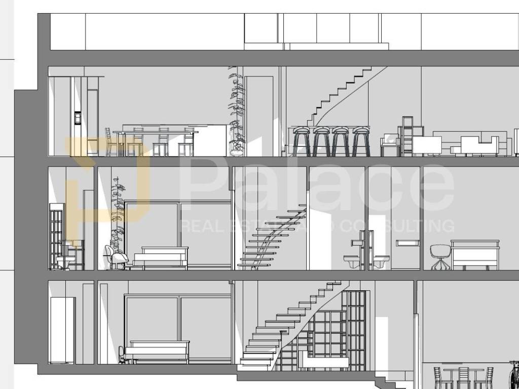 - zweite Etage: Wohnzimmer 18,98 m2, Bar mit Aussichtsterrasse (Meerblick) 8,30 m2, Küche und Esszimmer 20,40 m2, Außentreppe zur Dachterrasse 3,63 m2